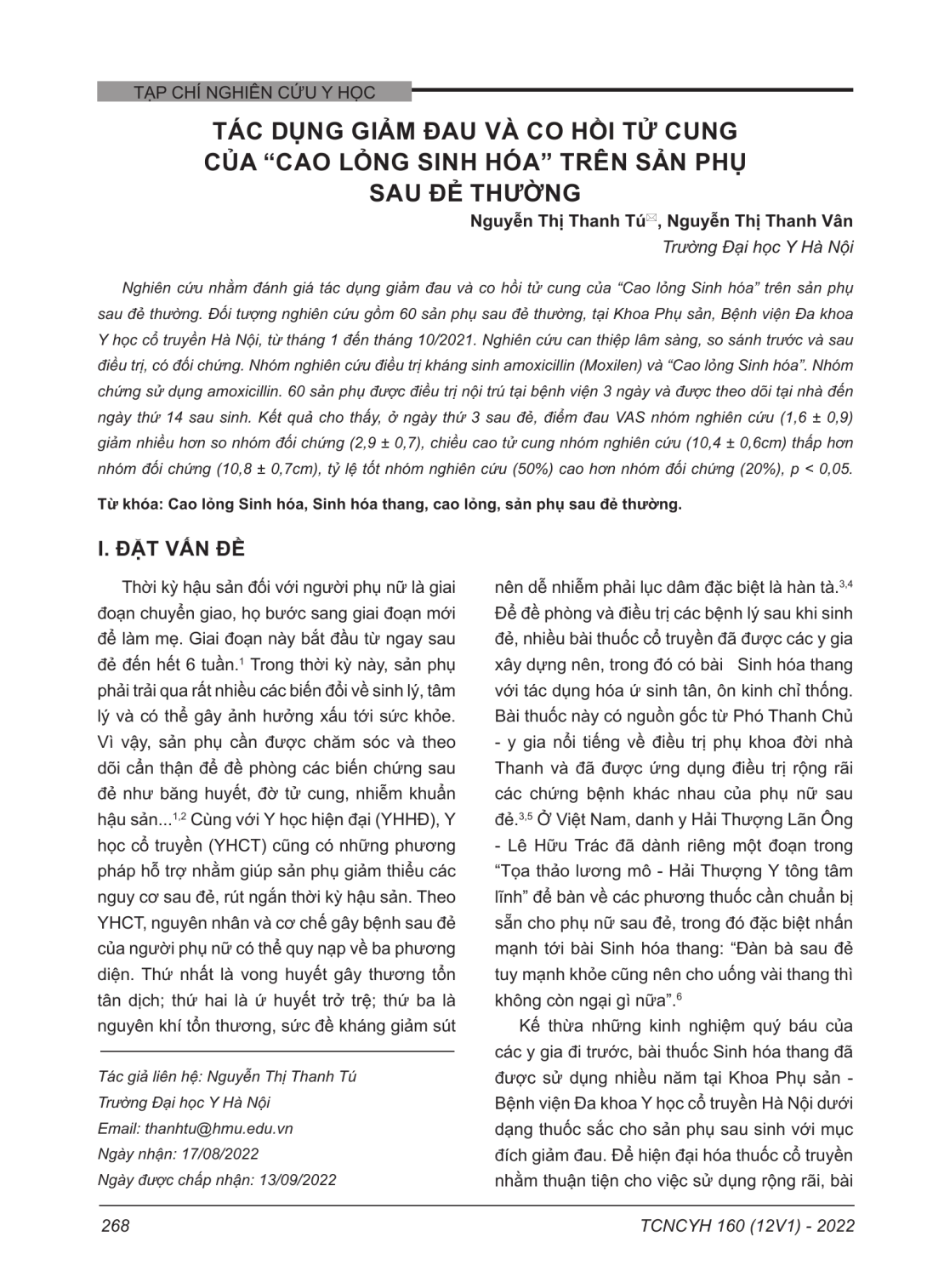 Nghiên cứu nhằm đánh giá tác dụng giảm đau và co hồi tử cung của “Cao lỏng Sinh hóa” trên sản phụ sau đẻ thường. Đối tượng nghiên cứu gồm 60 sản phụ sau đẻ thường, tại Khoa Phụ sản, Bệnh viện Đa khoa Y học cổ truyền Hà Nội, từ tháng 1 đến tháng 10/2021. Nghiên cứu can thiệp lâm sàng, so sánh trước và sau điều trị, có đối chứng. Nhóm nghiên cứu điều trị kháng sinh amoxicillin (Moxilen) và “Cao lỏng Sinh hóa”. Nhóm chứng sử dụng amoxicillin. 60 sản phụ được điều trị nội trú tại bệnh viện 3 ngày và được theo dõi tại nhà đến ngày thứ 14 sau sinh. Kết quả cho thấy, ở ngày thứ 3 sau đẻ, điểm đau VAS nhóm nghiên cứu (1,6 ± 0,9) giảm nhiều hơn so nhóm đối chứng (2,9 ± 0,7), chiều cao tử cung nhóm nghiên cứu (10,4 ± 0,6cm) thấp hơn nhóm đối chứng (10,8 ± 0,7cm), tỷ lệ tốt nhóm nghiên cứu (50%) cao hơn nhóm đối chứng (20%), p < 0,05.