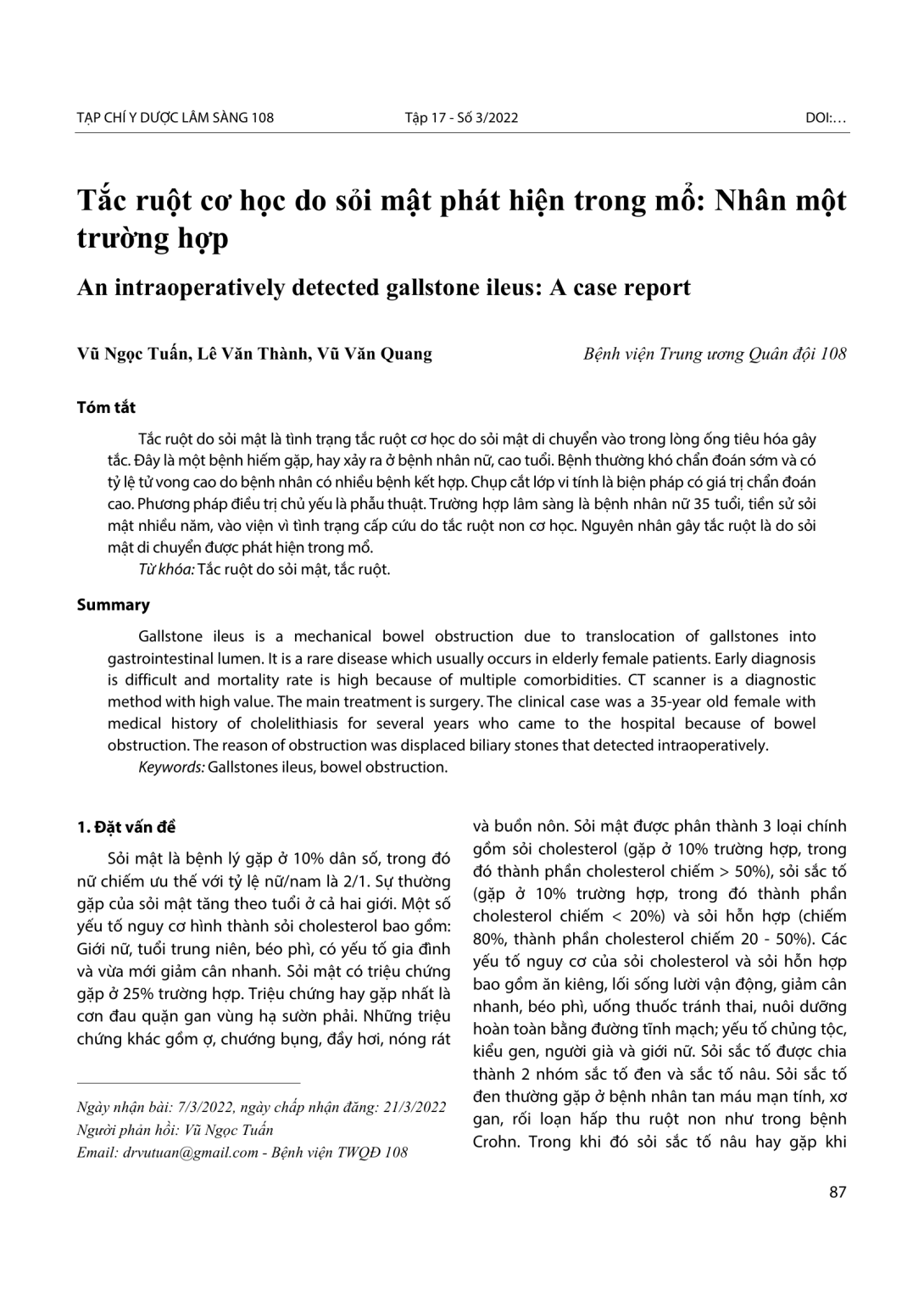 Tắc ruột do sỏi mật là tình trạng tắc ruột cơ học do sỏi mật di chuyển vào trong lòng ống tiêu hóa gây tắc. Đây là một bệnh hiếm gặp, hay xảy ra ở bệnh nhân nữ, cao tuổi. Bệnh thường khó chẩn đoán sớm và có tỷ lệ tử vong cao do bệnh nhân có nhiều bệnh kết hợp. Chụp cắt lớp vi tính là biện pháp có giá trị chẩn đoán cao. Phương pháp điều trị chủ yếu là phẫu thuật. Trường hợp lâm sàng là bệnh nhân nữ 35 tuổi, tiền sử sỏi mật nhiều năm, vào viện vì tình trạng cấp cứu do tắc ruột non cơ học. Nguyên nhân gây tắc ruột là do sỏi mật di chuyển được phát hiện trong mổ.