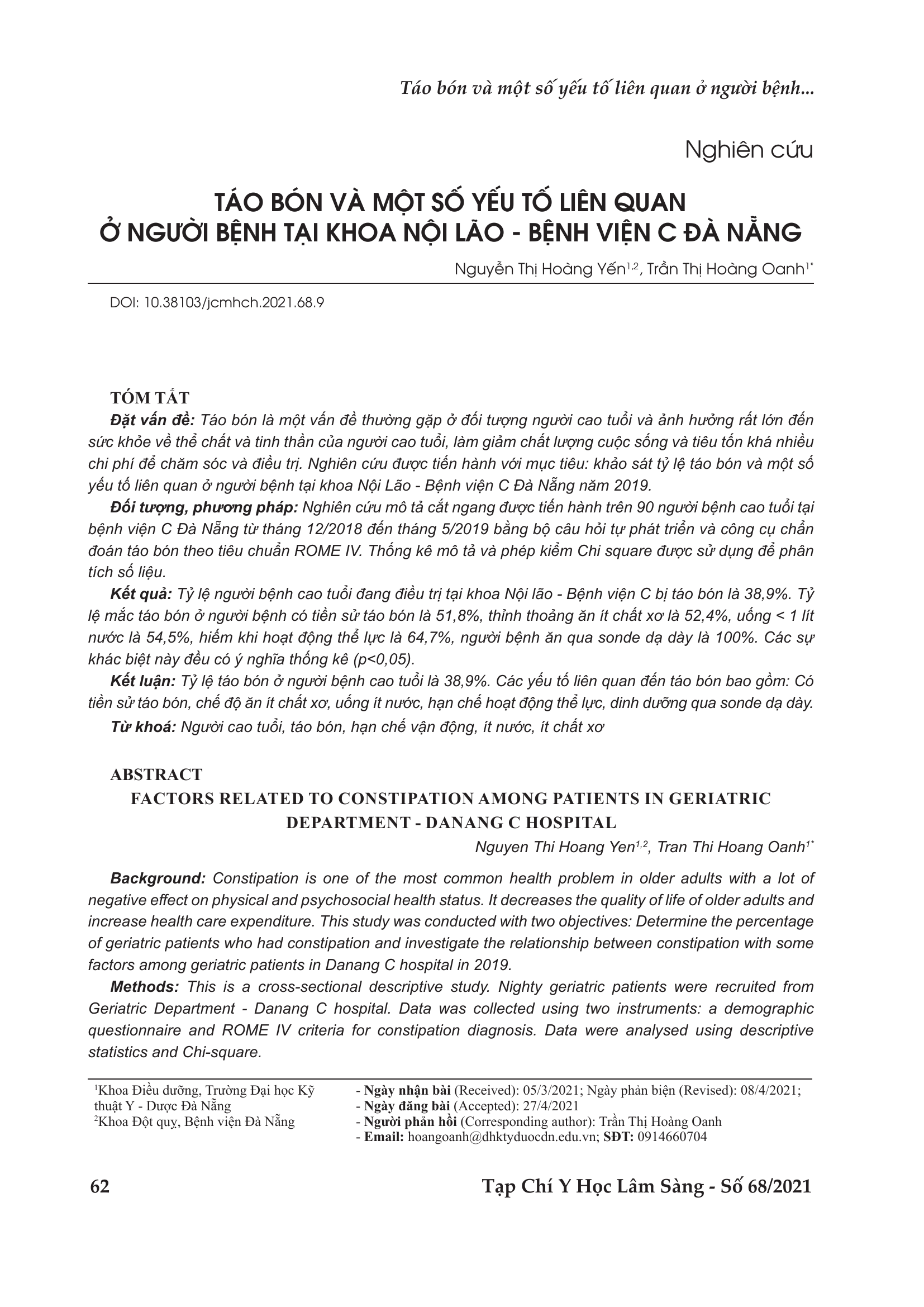 Táo bón là một vấn đề thường gặp ở đối tượng người cao tuổi và ảnh hưởng rất lớn đến sức khỏe về thể chất và tinh thần của người cao tuổi, làm giảm chất lượng cuộc sống và tiêu tốn khá nhiều chi phí để chăm sóc và điều trị. Nghiên cứu được tiến hành với mục tiêu khảo sát tỷ lệ táo bón và một số yếu tố liên quan ở người bệnh tại khoa Nội Lão - Bệnh viện C Đà Nẵng năm 2019. Đối tượng, phương pháp Nghiên cứu mô tả cắt ngang được tiến hành trên 90 người bệnh cao tuổi tại bệnh viện C Đà Nẵng từ tháng 12/2018 đến tháng 5/2019 bằng bộ câu hỏi tự phát triển và công cụ chẩn đoán táo bón theo tiêu chuẩn ROME IV. Thống kê mô tả và phép kiểm Chi square được sử dụng để phân tích số liệu. Kết quả Tỷ lệ người bệnh cao tuổi đang điều trị tại khoa Nội lão - Bệnh viện C bị táo bón là 38,9%. Tỷ lệ mắc táo bón ở người bệnh có tiền sử táo bón là 51,8%, thỉnh thoảng ăn ít chất xơ là 52,4%, uống < 1 lít nước là 54,5%, hiếm khi hoạt động thể lực là 64,7%, người bệnh ăn qua sonde dạ dày là 100%. Các sự khác biệt này đều có ý nghĩa thống kê (p<0,05). Kết luận Tỷ lệ táo bón ở người bệnh cao tuổi là 38,9%. Các yếu tố liên quan đến táo bón bao gồm Có tiền sử táo bón, chế độ ăn ít chất xơ, uống ít nước, hạn chế hoạt động thể lực, dinh dưỡng qua sonde dạ dày.