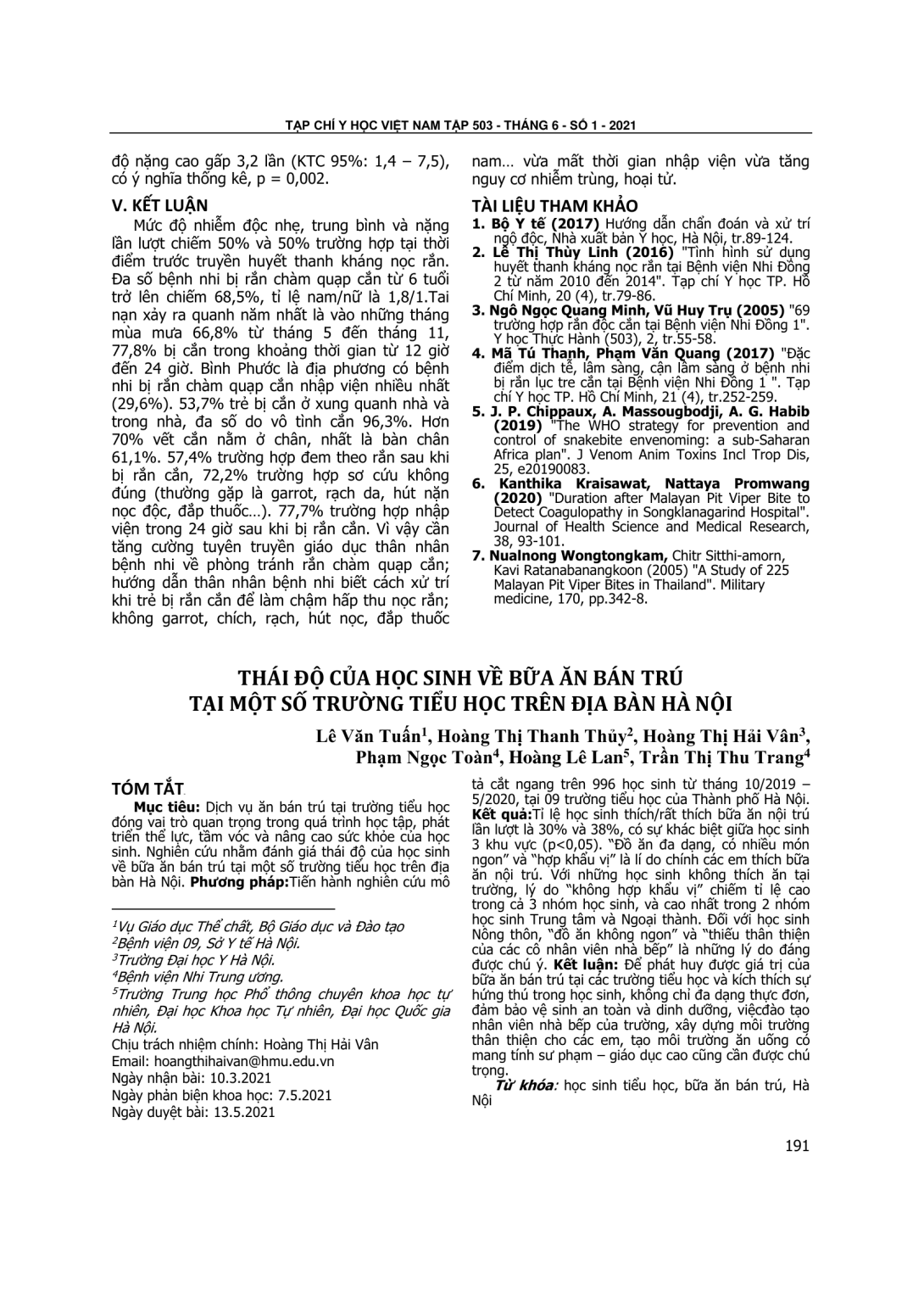 Dịch vụ ăn bán trú tại trường tiểu học đóng vai trò quan trọng trong quá trình học tập, phát triển thể lực, tầm vóc và nâng cao sức khỏe của học sinh. Nghiên cứu nhằm đánh giá thái độ của học sinh về bữa ăn bán trú tại một số trường tiểu học trên địa bàn Hà Nội. Phương phápTiến hành nghiên cứu mô tả cắt ngang trên 996 học sinh từ tháng 10/2019 – 5/2020, tại 09 trường tiểu học của Thành phố Hà Nội. Kết quảTỉ lệ học sinh thích/rất thích bữa ăn nội trú lần lượt là 30% và 38%, có sự khác biệt giữa học sinh 3 khu vực (p<0,05). “Đồ ăn đa dạng, có nhiều món ngon” và “hợp khẩu vị” là lí do chính các em thích bữa ăn nội trú. Với những học sinh không thích ăn tại trường, lý do “không hợp khẩu vị” chiếm tỉ lệ cao trong cả 3 nhóm học sinh, và cao nhất trong 2 nhóm học sinh Trung tâm và Ngoại thành. Đối với học sinh Nông thôn, “đồ ăn không ngon” và “thiếu thân thiện của các cô nhân viên nhà bếp” là những lý do đáng được chú ý. Kết luận Để phát huy được giá trị của bữa ăn bán trú tại các trường tiểu học và kích thích sự hứng thú trong học sinh, không chỉ đa dạng thực đơn, đảm bảo vệ sinh an toàn và dinh dưỡng, việcđào tạo nhân viên nhà bếp của trường, xây dựng môi trường thân thiện cho các em, tạo môi trường ăn uống có mang tính sư phạm – giáo dục cao cũng cần được chú trọng.