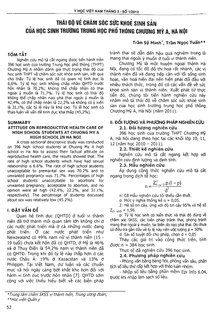 Thái độ về chăm sóc sức khỏe sinh sản của học sinh trường Trung học phổ thông Chương Mỹ A, Hà Nội