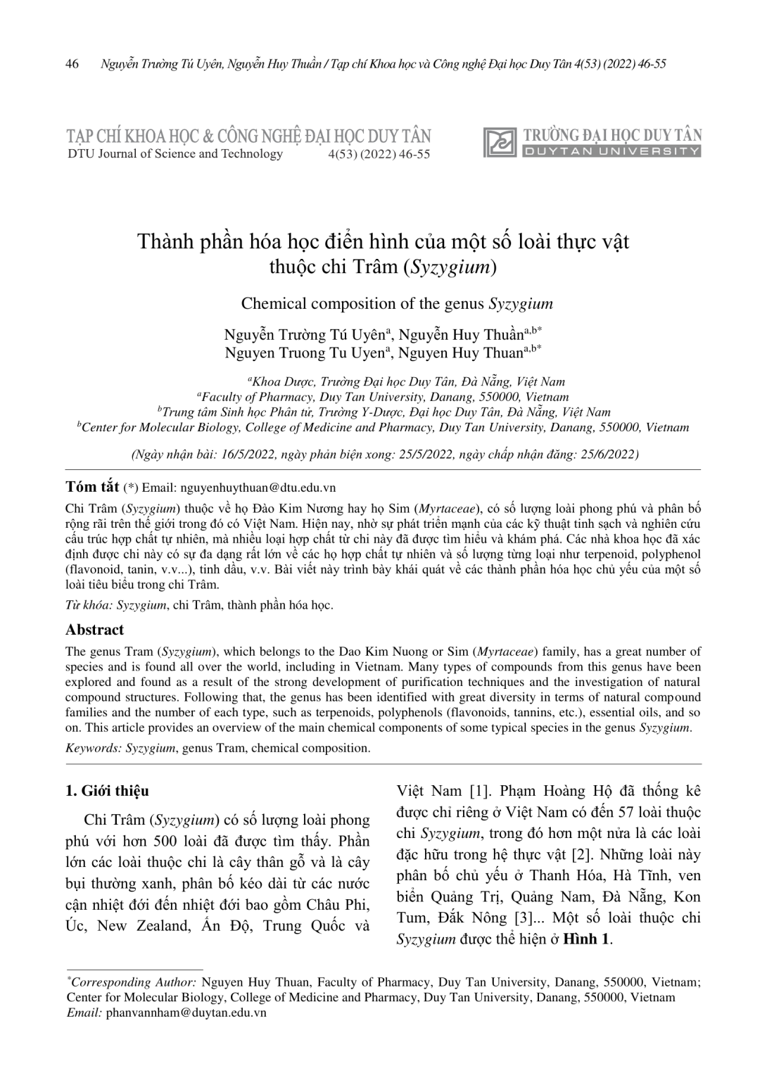 The genus Tram (Syzygium), which belongs to the Dao Kim Nuong or Sim (Myrtaceae) family, has a great number of species and is found all over the world, including in Vietnam. Many types of compounds f-rom this genus have been explored and found as a result of the strong development of purification techniques and the investigation of natural compound structures. Following that, the genus has been identified with great diversity in terms of natural compound families and the number of each type, such as terpenoids, polyphenols (flavonoids, tannins, etc.), essential oils, and so on. This article provides an overview of the main chemical components of some typical species in the genus Syzygium.