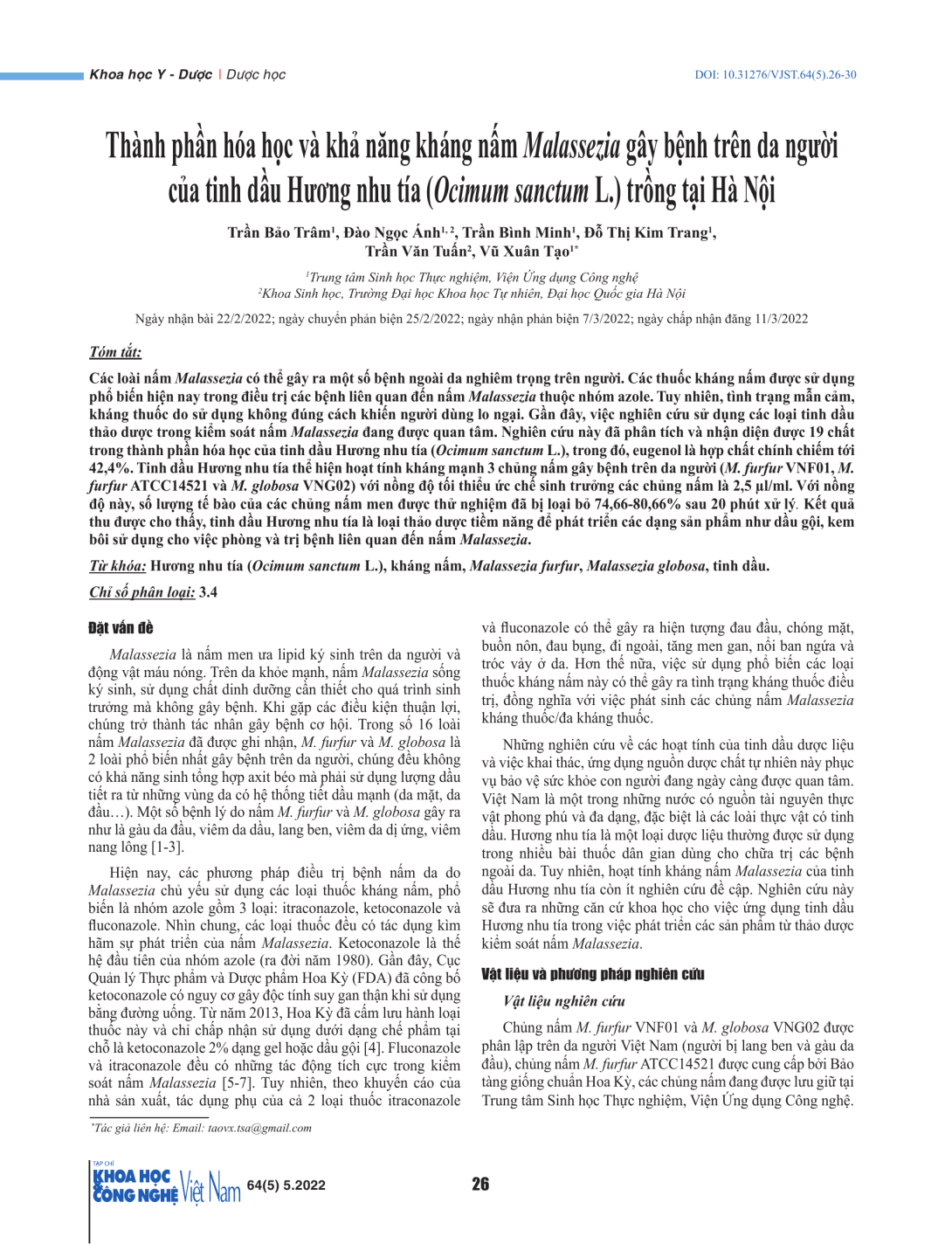 Các loài nấm Malassezia có thể gây ra một số bệnh ngoài da nghiêm trọng trên người. Các thuốc kháng nấm được sử dụng phổ biến hiện nay trong điều trị các bệnh liên quan đến nấm Malassezia thuộc nhóm azole. Tuy nhiên, tình trạng mẫn cảm, kháng thuốc do sử dụng không đúng cách khiến người dùng lo ngại. Gần đây, việc nghiên cứu sử dụng các loại tinh dầu thảo dược trong kiểm soát nấm Malassezia đang được quan tâm. Nghiên cứu này đã phân tích và nhận diện được 19 chất trong thành phần hóa học của tinh dầu Hương nhu tía (Ocimum sanctum L.), trong đó, eugenol là hợp chất chính chiếm tới 42,4%. Tinh dầu Hương nhu tía thể hiện hoạt tính kháng mạnh 3 chủng nấm gây bệnh trên da người (M. furfur VNF01, M. furfur ATCC14521 và M. globosa VNG02) với nồng độ tối thiểu ức chế sinh trưởng các chủng nấm là 2,5 µl/ml. Với nồng độ này, số lượng tế bào của các chủng nấm men được thử nghiệm đã bị loại bỏ 74,66-80,66% sau 20 phút xử lý. Kết quả thu được cho thấy, tinh dầu Hương nhu tía là loại thảo dược tiềm năng để phát triển các dạng sản phẩm như dầu gội, kem bôi sử dụng cho việc phòng và trị bệnh liên quan đến nấm Malassezia.
