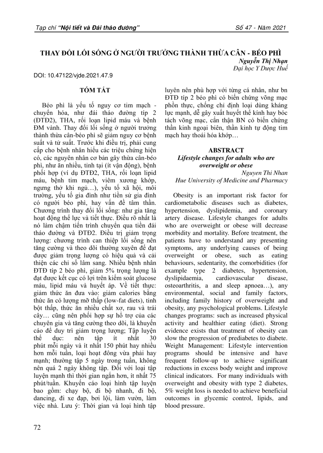Béo phì là yếu tố nguy cơ tim mạch - chuyển hóa, như đái tháo đường típ 2 (ĐTĐ2), THA, rối loạn lipid máu và bệnh ĐM vành. Thay đổi lối sống ở người trưởng thành thừa cân-béo phì sẽ giảm nguy cơ bệnh suất và tử suất. Trước khi điều trị, phải cung cấp cho bệnh nhân hiểu các triệu chứng hiện có, các nguyên nhân cơ bản gây thừa cân-béo phì, như ăn nhiều, tỉnh tại (ít vận động), bệnh phối hợp (ví dụ ĐTĐ2, THA, rối loạn lipid máu, bệnh tim mạch, viêm xương khớp, ngưng thở khi ngủ…), yếu tố xã hội, môi trường, yếu tố gia đình như tiền sử gia đình có người béo phì, hay vấn đề tâm thần. Chương trình thay đổi lối sống: như gia tăng hoạt động thể lực và tiết thực. Điều rõ nhất là nó làm chậm tiến trình chuyển qua tiền đái tháo đường và ĐTĐ2. Điều trị giảm trọng lượng: chương trình can thiệp lối sống nên tăng cường và theo dõi thường xuyên để đạt được giảm trọng lượng có hiệu quả và cải thiện các chỉ số lâm sang. Nhiều bệnh nhân ĐTĐ típ 2 béo phì, giảm 5% trọng lượng là đạt được kết cục có lợi trên kiểm soát glucose máu, lipid máu và huyết áp. Về tiết thực: giảm thức ăn đưa vào: giảm calories bằng thức ăn có lượng mỡ thấp (low-fat diets), tinh bột thấp, thức ăn nhiều chất xơ, rau và trái cây… cũng nên phối hợp sự hổ trợ của các chuyên gia và tăng cường theo dõi, là khuyến cáo để duy trì giảm trọng lượng; Tập luyện thể dục: nên tập ít nhất 30 phút mỗi ngày và ít nhất 150 phút hay nhiều hơn mỗi tuần, loại hoạt đông vừa phải hay mạnh; thường tập 5 ngày trong tuần, không nên quá 2 ngày không tập. Đối với loại tập luyện mạnh thì thời gian ngắn hơn, ít nhất 75 phút/tuần. Khuyến cáo loại hình tập luyện bao gồm: chạy bộ, đi bộ nhanh, đi bộ, dancing, đi xe đạp, bơi lội, làm vườn, làm việc nhà
