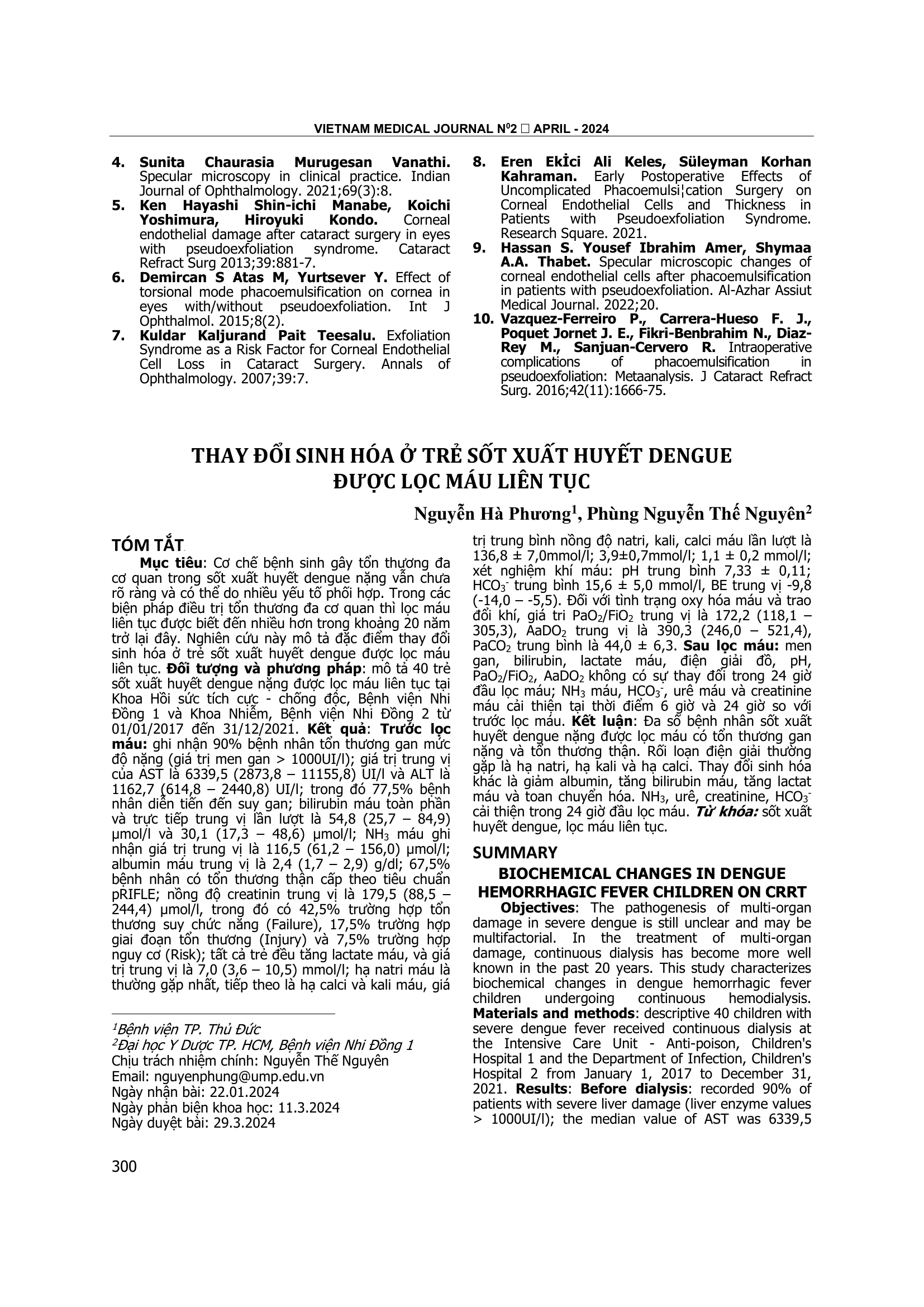 Cơ chế bệnh sinh gây tổn thương đa cơ quan trong sốt xuất huyết dengue nặng vẫn chưa rõ ràng và có thể do nhiều yếu tố phối hợp. Trong các biện pháp điều trị tổn thương đa cơ quan thì lọc máu liên tục được biết đến nhiều hơn trong khoảng 20 năm trở lại đây. Nghiên cứu này mô tả đặc điểm thay đổi sinh hóa ở trẻ sốt xuất huyết dengue được lọc máu liên tục. Đối tượng và phương pháp: mô tả 40 trẻ sốt xuất huyết dengue nặng được lọc máu liên tục tại Khoa Hồi sức tích cực - chống độc, Bệnh viện Nhi Đồng 1 và Khoa Nhiễm, Bệnh viện Nhi Đồng 2 từ 01/01/2017 đến 31/12/2021. Kết quả: Trước lọc máu: ghi nhận 90% bệnh nhân tổn thương gan mức độ nặng (giá trị men gan > 1000UI/l); giá trị trung vị của AST là 6339,5 (2873,8 – 11155,8) UI/l và ALT là 1162,7 (614,8 – 2440,8) UI/l; trong đó 77,5% bệnh nhân diễn tiến đến suy gan; bilirubin máu toàn phần và trực tiếp trung vị lần lượt là 54,8 (25,7 – 84,9) μmol/l và 30,1 (17,3 – 48,6) μmol/l; NH3 máu ghi nhận giá trị trung vị là 116,5 (61,2 – 156,0) μmol/l; albumin máu trung vị là 2,4 (1,7 – 2,9) g/dl; 67,5% bệnh nhân có tổn thương thận cấp theo tiêu chuẩn pRIFLE; nồng độ creatinin trung vị là 179,5 (88,5 – 244,4) μmol/l, trong đó có 42,5% trường hợp tổn thương suy chức năng (Failure), 17,5% trường hợp giai đoạn tổn thương (Injury) và 7,5% trường hợp nguy cơ (Risk); tất cả trẻ đều tăng lactate máu, và giá trị trung vị là 7,0 (3,6 – 10,5) mmol/l; hạ natri máu là thường gặp nhất, tiếp theo là hạ calci và kali máu, giá trị trung bình nồng độ natri, kali, calci máu lần lượt là 136,8 ± 7,0mmol/l; 3,9±0,7mmol/l; 1,1 ± 0,2 mmol/l; xét nghiệm khí máu: pH trung bình 7,33 ± 0,11; HCO3- trung bình 15,6 ± 5,0 mmol/l, BE trung vị -9,8 (-14,0 – -5,5). Đối với tình trạng oxy hóa máu và trao đổi khí, giá tri PaO2/FiO2 trung vị là 172,2 (118,1 – 305,3), AaDO2 trung vị là 390,3 (246,0 – 521,4), PaCO2 trung bình là 44,0 ± 6,3. Sau lọc máu: men gan, bilirubin, lactate máu, điện giải đồ, pH, PaO2/FiO2, AaDO2 không có sự thay đổi trong 24 giờ đầu lọc máu; NH3 máu, HCO3-, urê máu và creatinine máu cải thiện tại thời điểm 6 giờ và 24 giờ so với trước lọc máu. Kết luận: Đa số bệnh nhân sốt xuất huyết dengue nặng được lọc máu có tổn thương gan nặng và tổn thương thận. Rối loạn điện giải thường gặp là hạ natri, hạ kali và hạ calci. Thay đổi sinh hóa khác là giảm albumin, tăng bilirubin máu, tăng lactat máu và toan chuyển hóa. NH3, urê, creatinine, HCO3- cải thiện trong 24 giờ đầu lọc máu.