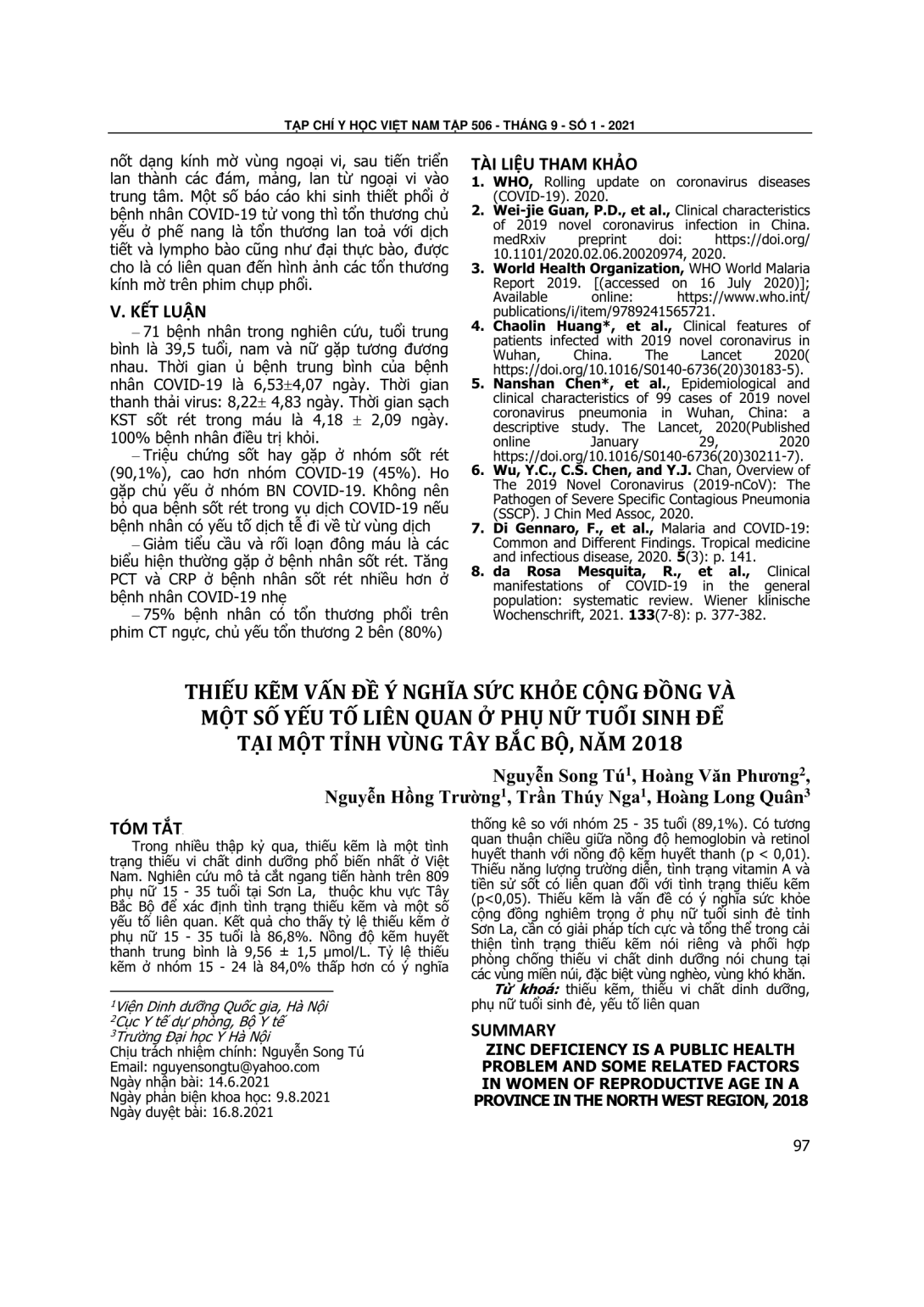 Trong nhiều thập kỷ qua, thiếu kẽm là một tình trạng thiếu vi chất dinh dưỡng phổ biến nhất ở Việt Nam. Nghiên cứu mô tả cắt ngang tiến hành trên 809 phụ nữ 15 - 35 tuổi tại Sơn La, thuộc khu vực Tây Bắc Bộ để xác định tình trạng thiếu kẽm và một số yếu tố liên quan. Kết quả cho thấy tỷ lệ thiếu kẽm ở phụ nữ 15 - 35 tuổi là 86,8%. Nồng độ kẽm huyết thanh trung bình là 9,56 ± 1,5 μmol/L. Tỷ lệ thiếu kẽm ở nhóm 15 - 24 là 84,0% thấp hơn có ý nghĩa thống kê so với nhóm 25 - 35 tuổi (89,1%). Có tương quan thuận chiều giữa nồng độ hemoglobin và retinol huyết thanh với nồng độ kẽm huyết thanh (p < 0,01). Thiếu năng lượng trường diễn, tình trạng vitamin A và tiền sử sốt có liên quan đối với tình trạng thiếu kẽm (p<0,05). Thiếu kẽm là vấn đề có ý nghĩa sức khỏe cộng đồng nghiêm trọng ở phụ nữ tuổi sinh đẻ tỉnh Sơn La, cần có giải pháp tích cực và tổng thể trong cải thiện tình trạng thiếu kẽm nói riêng và phối hợp phòng chống thiếu vi chất dinh dưỡng nói chung tại các vùng miền núi, đặc biệt vùng nghèo, vùng khó khăn.