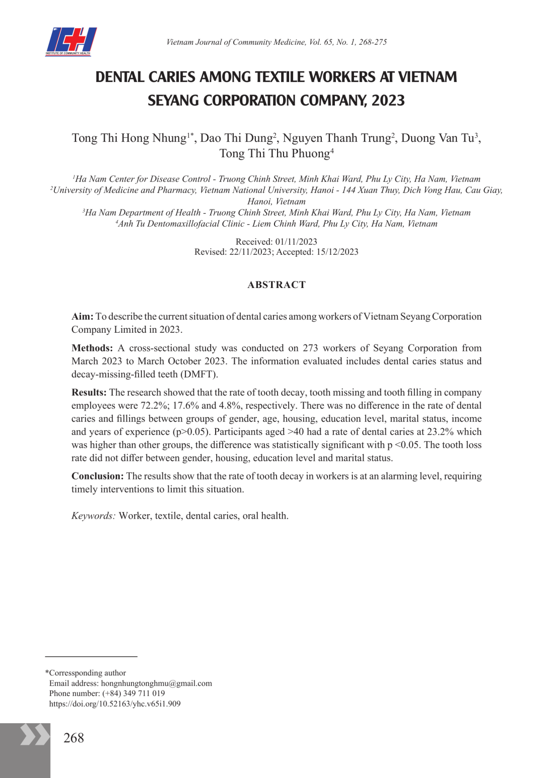 To describe the current situation of dental caries among workers of Vietnam Seyang Corporation Company Limited in 2023. Methods: A cross-sectional study was conducted on 273 workers of Seyang Corporation from March 2023 to March October 2023. The information evaluated includes dental caries status and decay-missing-filled teeth (DMFT). Results: The research showed that the rate of tooth decay, tooth missing and tooth filling in company employees were 72.2%; 17.6% and 4.8%, respectively. There was no difference in the rate of dental caries and fillings between groups of gender, age, housing, education level, marital status, income and years of experience (p>0.05). Participants aged >40 had a rate of dental caries at 23.2% which was higher than other groups, the difference was statistically significant with p <0.05. The tooth loss rate did not differ between gender, housing, education level and marital status. Conclusion: The results show that the rate of tooth decay in workers is at an alarming level, requiring timely interventions to limit this situation.