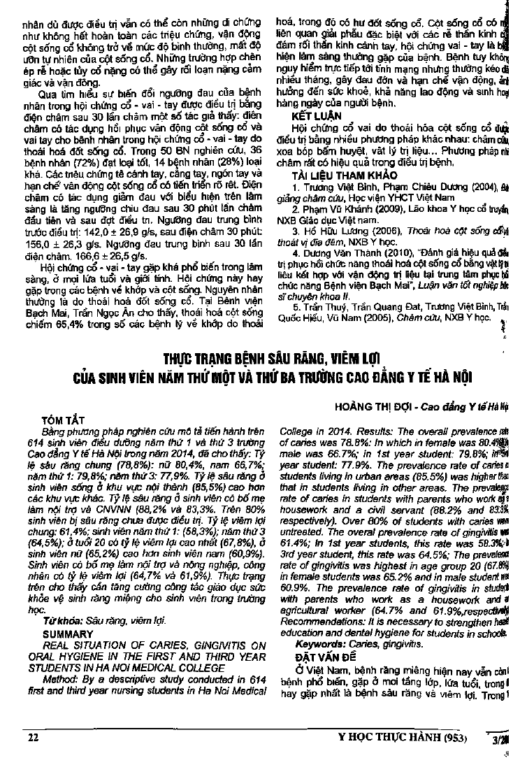 Method: By a descriptive study conducted in 614 first and third year nursing students in Ha Noi Medical College in 2014. Results: The overall prevalence rate of caries was 78.8 percent: In which in female was 80.4 percent, in male was 66.7 percent; in 1st year student: 79.8 percent; in 3rd year student: 77.9 percent. The prevalence rate of caries in students living in urban areas (85i5 percent) was higher than that in students living in other areas. The prevalence rate of caries in students with parents who work as a housework and a civil servant (88.2 percent and 83.3 percent, respectively). Over 80 percent of students with caries were untreated. The overal prevalence rate of gingivitis was 61.4 percent; In 1st year students, this ,rate was 58.3 percent; In 3rd year student, this rate was 64.5 percent; The prevalence rate of gingivitis was highest in age group 20 (67.8 percent), in female students was 65.2 percent and in male student was 60.9 percent. The prevalence rate of gingivitis in students with parents who work as a housework and an agricultural worker (64.7 percent and 61. 9 percent, respectively). Recommendations: It is necessary to strengthen health education and dental hygiene for students in schools.