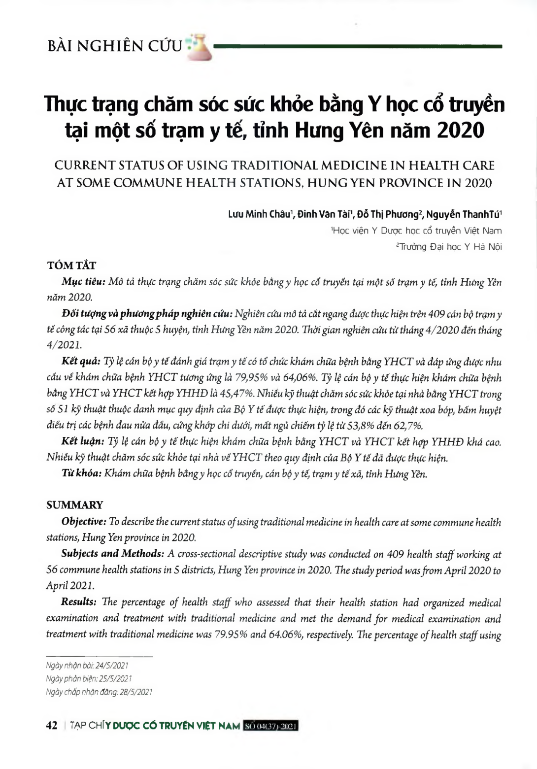 Thực trạng chăm sóc sức khỏe bằng Y học cổ truyền tại một số trạm y tế, tỉnh Hưng Yên năm 2020