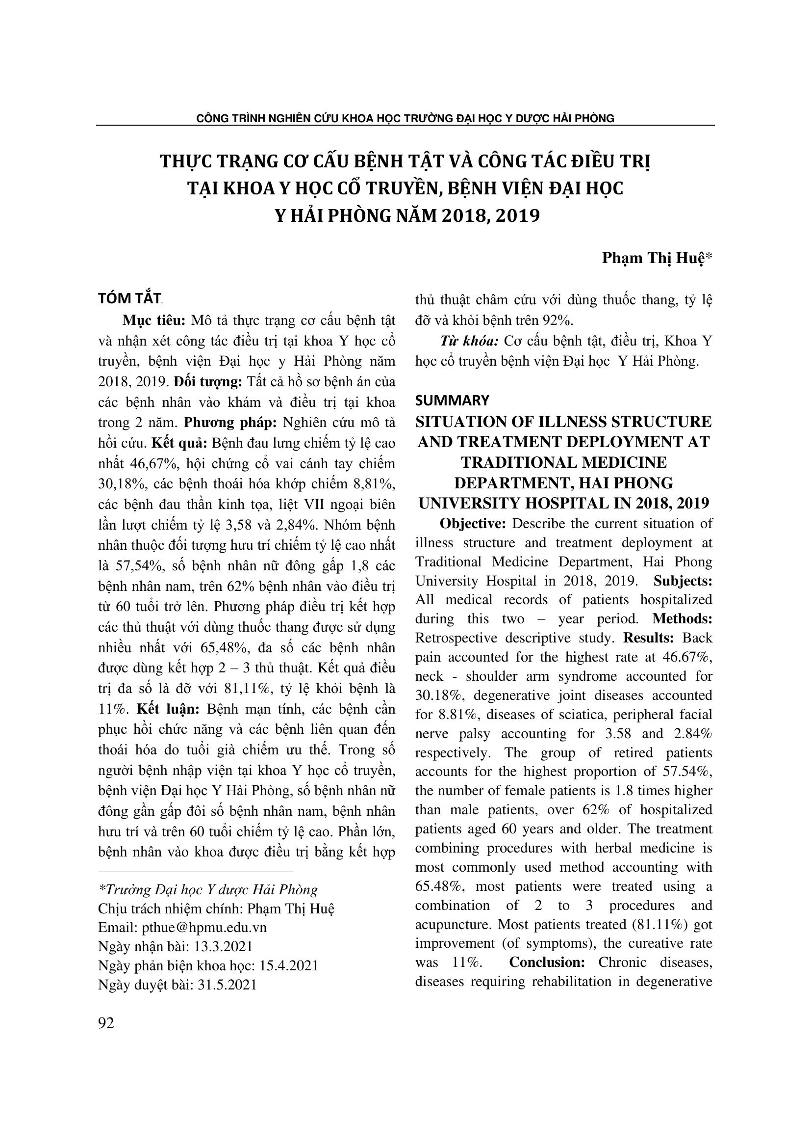 Mô tả thực trạng cơ cấu bệnh tật và nhận xét công tác điều trị tại khoa Y học cổ truyền, bệnh viện Đại học y Hải Phòng năm 2018, 2019. Đối tượng: Tất cả hồ sơ bệnh án của các bệnh nhân vào khám và điều trị tại khoa trong 2 năm. Phương pháp: Nghiên cứu mô tả hồi cứu. Kết quả: Bệnh đau lưng chiếm tỷ lệ cao nhất 46,67%, hội chứng cổ vai cánh tay chiếm 30,18%, các bệnh thoái hóa khớp chiếm 8,81%, các bệnh đau thần kinh tọa, liệt VII ngoại biên lần lượt chiếm tỷ lệ 3,58 và 2,84%. Nhóm bệnh nhân thuộc đối tượng hưu trí chiếm tỷ lệ cao nhất là 57,54%, số bệnh nhân nữ đông gấp 1,8 các bệnh nhân nam, trên 62% bệnh nhân vào điều trị từ 60 tuổi trở lên. Phương pháp điều trị kết hợp các thủ thuật với dùng thuốc thang được sử dụng nhiều nhất với 65,48%, đa số các bệnh nhân được dùng kết hợp 2 – 3 thủ thuật. Kết quả điều trị đa số là đỡ với 81,11%, tỷ lệ khỏi bệnh là 11%. Kết luận: Bệnh mạn tính, các bệnh cần phục hồi chức năng và các bệnh liên quan đến thoái hóa do tuổi già chiếm ưu thế. Trong số người bệnh nhập viện tại khoa Y học cổ truyền, bệnh viện Đại học Y Hải Phòng, số bệnh nhân nữ đông gần gấp đôi số bệnh nhân nam, bệnh nhân hưu trí và trên 60 tuổi chiếm tỷ lệ cao. Phần lớn, bệnh nhân vào khoa được điều trị bằng kết hợp thủ thuật châm cứu với dùng thuốc thang, tỷ lệ đỡ và khỏi bệnh trên 92%.