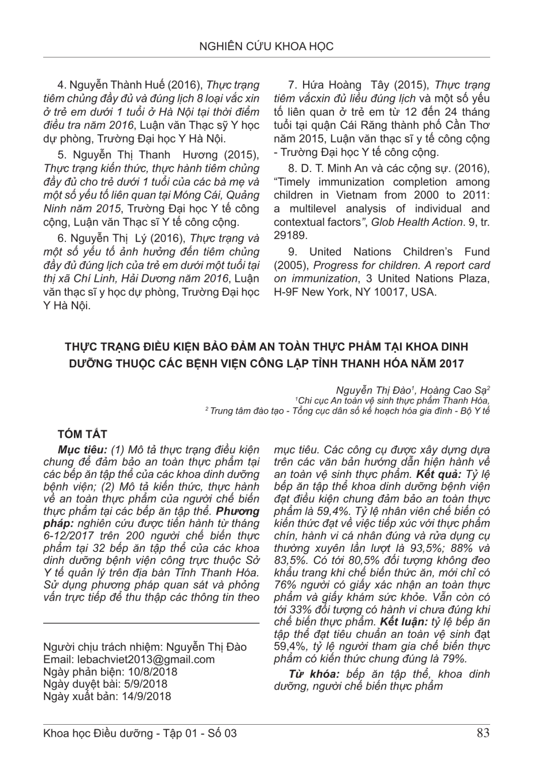 Describe the general conditions of food safety in the kitchen kitchens of the hospital nutrition departments; (2) Describe the knowledge and practice of food safety of food processors in collective kitchens. Methods The study was conducted from June to December 2017 on 200 food processors at 32 collective kitchens of nutrition departments of public hospitals under the management of healthcare in Thanh Hoa province. Use a direct observation and interview method to gather targeted information. The tools are based on current guidelines on food safety and hygiene. Results The rate of shared nutritional nutrition of the hospital was 59.4%. The percentage of knowledge workers who have reached exposure to ripe foods, proper personal behavior, and regular device washing is 93.5%; 88% and 83.5% respectively. As many as 80.5% of people do not wear masks when making food, only 76% have food safety certificates and health certificates. There are still up to 33% of those who behaved incorrectly when processing food.
