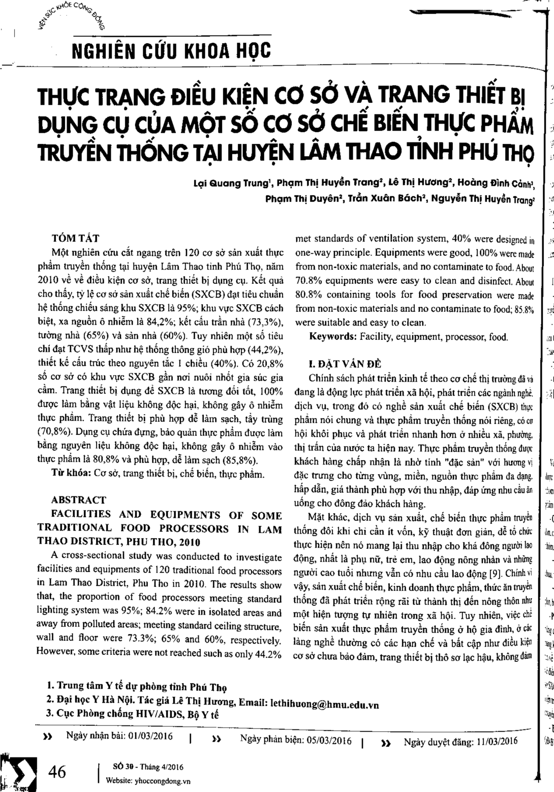 Thực trạng điều kiện cơ sở và trang thiết bị dụng cụ của một số cơ sở chế biến thực phẩm truyền thống tại huyện Lâm Thao, tỉnh Phú Thọ
