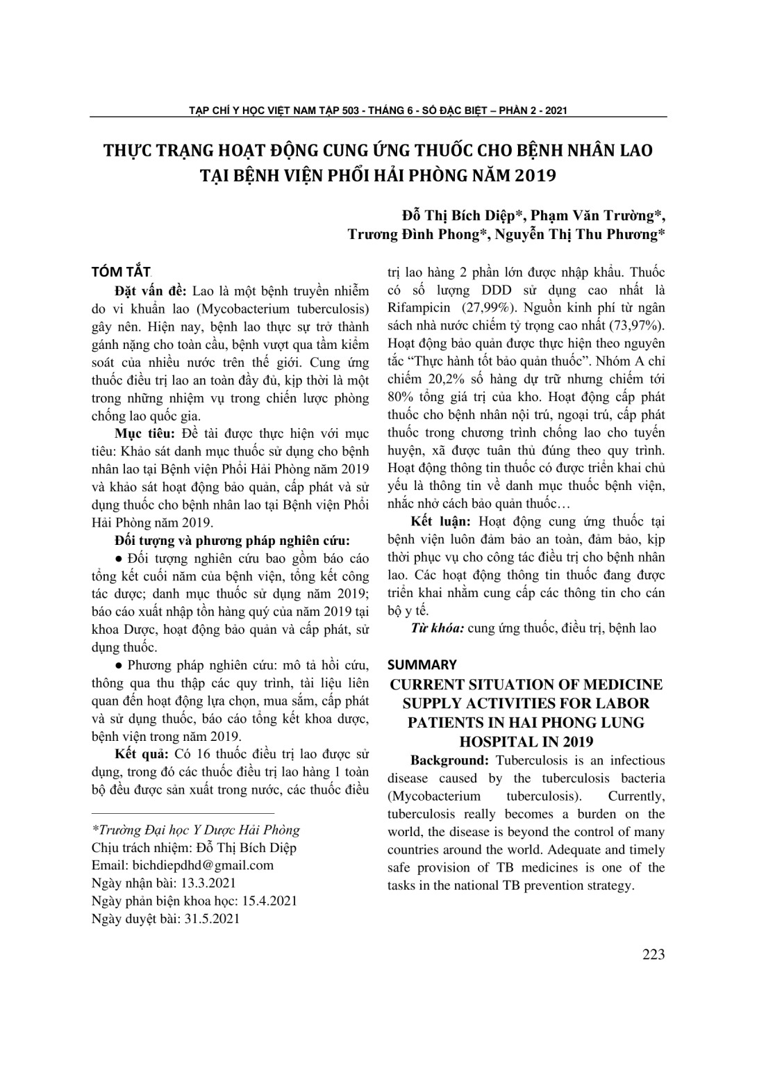 Đề tài được thực hiện với mục tiêu: Khảo sát danh mục thuốc sử dụng cho bệnh nhân lao tại Bệnh viện Phổi Hải Phòng năm 2019 và khảo sát hoạt động bảo quản, cấp phát và sử dụng thuốc cho bệnh nhân lao tại Bệnh viện Phổi Hải Phòng năm 2019. Đối tượng và phương pháp nghiên cứu: Đối tượng nghiên cứu bao gồm báo cáo tổng kết cuối năm của bệnh viện, tổng kết công tác dược; danh mục thuốc sử dụng năm 2019; báo cáo xuất nhập tồn hàng quý của năm 2019 tại khoa Dược, hoạt động bảo quản và cấp phát, sử dụng thuốc. Phương pháp nghiên cứu: mô tả hồi cứu, thông qua thu thập các quy trình, tài liệu liên quan đến hoạt động lựa chọn, mua sắm, cấp phát và sử dụng thuốc, báo cáo tổng kết khoa dược, bệnh viện trong năm 2019. Kết quả: Có 16 thuốc điều trị lao được sử dụng, trong đó các thuốc điều trị lao hàng 1 toàn bộ đều được sản xuất trong nước, các thuốc điều trị lao hàng 2 phần lớn được nhập khẩu. Thuốc có số lượng DDD sử dụng cao nhất là Rifampicin (27,99%). Nguồn kinh phí từ ngân sách nhà nước chiếm tỷ trọng cao nhất (73,97%). Hoạt động bảo quản được thực hiện theo nguyên tắc “Thực hành tốt bảo quản thuốc”. Nhóm A chỉ chiếm 20,2% số hàng dự trữ nhưng chiếm tới 80% tổng giá trị của kho. Hoạt động cấp phát thuốc cho bệnh nhân nội trú, ngoại trú, cấp phát thuốc trong chương trình chống lao cho tuyến huyện, xã được tuân thủ đúng theo quy trình. Hoạt động thông tin thuốc có được triển khai chủ yếu là thông tin về danh mục thuốc bệnh viện, nhắc nhở cách bảo quản thuốc… Kết luận: Hoạt động cung ứng thuốc tại bệnh viện luôn đảm bảo an toàn, đảm bảo, kịp thời phục vụ cho công tác điều trị cho bệnh nhân lao. Các hoạt động thông tin thuốc đang được triển khai nhằm cung cấp các thông tin cho cán bộ y tế.