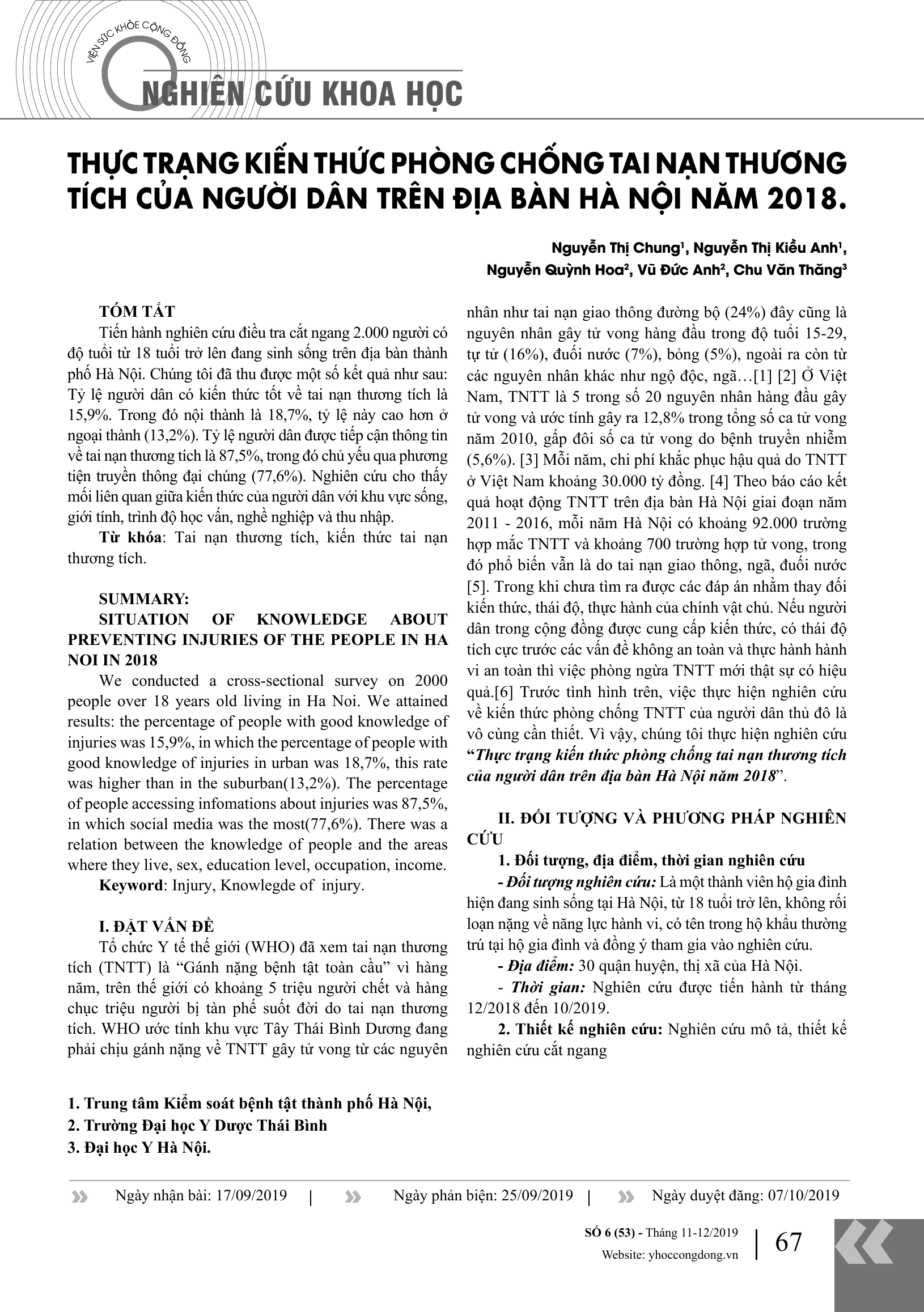 Tiến hành nghiên cứu điều tra cắt ngang 2.000 người có độ tuổi từ 18 tuổi trở lên đang sinh sống trên địa bàn thành phố Hà Nội, đã thu được một số kết quả như sau Tỷ lệ người dân có kiến thức tốt về tai nạn thương tích là 15,9%. Trong đó nội thành là 18,7%, tỷ lệ này cao hơn ở ngoại thành (13,2%). Tỷ lệ người dân được tiếp cận thông tin về tai nạn thương tích là 87,5%, trong đó chủ yếu qua phương tiện truyền thông đại chúng (77,6%). Nghiên cứu cho thấy mối liên quan giữa kiến thức của người dân với khu vực sống, giới tính, trình độ học vấn, nghề nghiệp và thu nhập.
