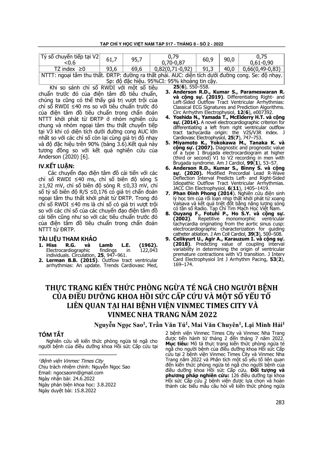 Nghiên cứu về kiến thức phòng ngừa té ngã cho người bệnh của điều dưỡng khoa Hồi sức Cấp cứu tại 2 bệnh viện Vinmec Times City và Vinmec Nha Trang được tiến hành từ tháng 2 đến tháng 7 năm 2022. Mục tiêu: Mô tả thực trạng kiến thức phòng ngừa té ngã cho người bệnh của điều dưỡng khoa Hồi sức Cấp cứu tại 2 bệnh viện Vinmec Times City và Vinmec Nha Trang năm 2022 và Phân tích một số yếu tố liên quan đến kiến thức phòng ngừa té ngã cho người bệnh của điều dưỡng khoa Hồi sức Cấp cứu. Đối tượng và phương pháp nghiên cứu: 126 điều dưỡng tại khoa Hồi sức Cấp cứu 2 bệnh viện được lựa chọn và hoàn thành các biểu mẫu câu hỏi về kiến thức phòng ngừa té ngã cho người bệnh với phương pháp nghiên cứu mô tả cắt ngang. Kết quả: 67,5% điều dưỡng có kiến thức về phòng ngừa té ngã cho người bệnh ở mức đạt, nhóm điều dưỡng có thâm niên công tác tại khoa Hồi sức Cấp cứu từ 0-5 năm có kiến thức về phòng ngừa té ngã chỉ ở mức 59,2% kém hơn so với nhóm có thâm niên công tác tại khoa Hồi sức Cấp cứu trên 5 năm với tỷ lệ 78,2%, sự khác biệt có ý nghĩa thống kê (POR=2,47; 95%CI: 1,12-5,48; p=0,03).
