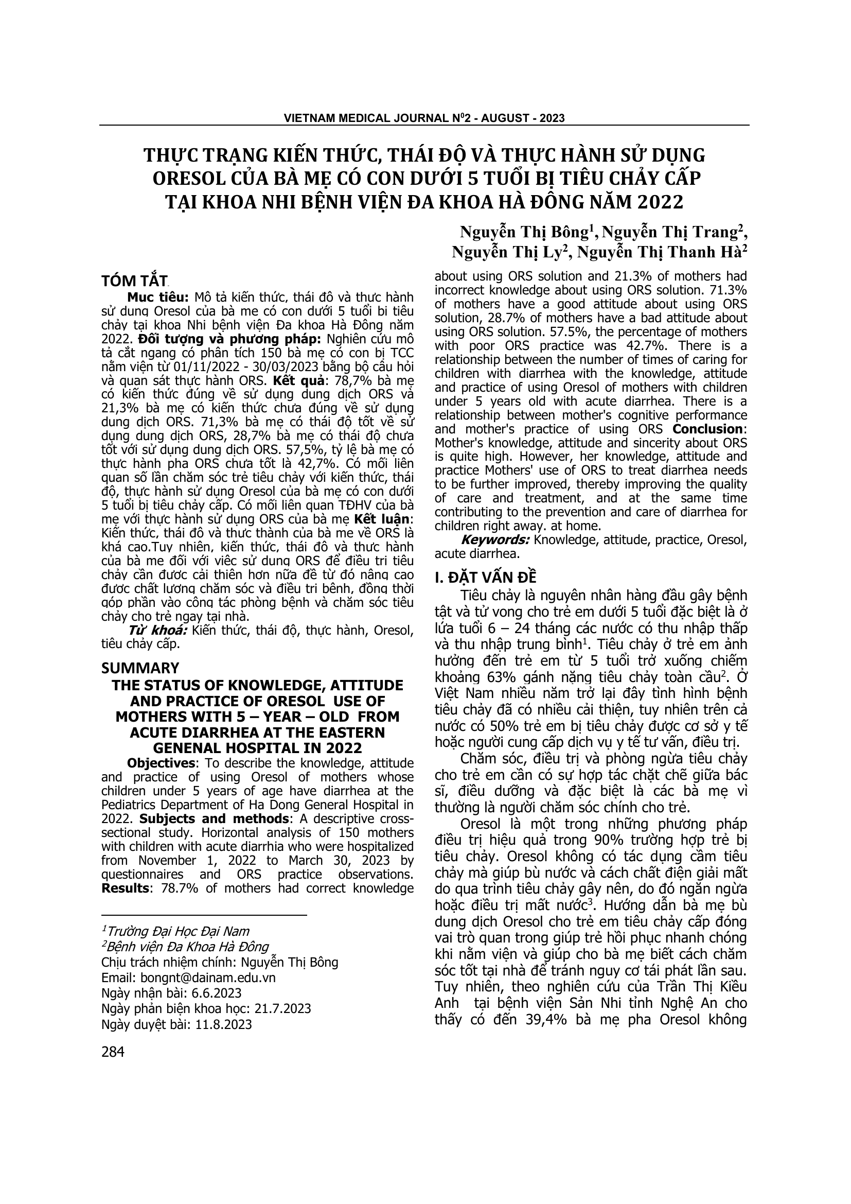 Mô tả kiến thức, thái độ và thực hành sử dụng Oresol của bà mẹ có con dưới 5 tuổi bị tiêu chảy tại khoa Nhi bệnh viện Đa khoa Hà Đông năm 2022. Đối tượng và phương pháp: Nghiên cứu mô tả cắt ngang có phân tích 150 bà mẹ có con bị TCC nằm viện từ 01/11/2022 - 30/03/2023 bằng bộ câu hỏi và quan sát thực hành ORS. Kết quả: 78,7% bà mẹ có kiến thức đúng về sử dụng dung dịch ORS và 21,3% bà mẹ có kiến thức chưa đúng về sử dụng dung dịch ORS. 71,3% bà mẹ có thái độ tốt về sử dụng dung dịch ORS, 28,7% bà mẹ có thái độ chưa tốt với sử dụng dung dịch ORS. 57,5%, tỷ lệ bà mẹ có thực hành pha ORS chưa tốt là 42,7%. Có mối liên quan số lần chăm sóc trẻ tiêu chảy với kiến thức, thái độ, thực hành sử dụng Oresol của bà mẹ có con dưới 5 tuổi bị tiêu chảy cấp. Có mối liên quan TĐHV của bà mẹ với thực hành sử dụng ORS của bà mẹ Kết luận: Kiến thức, thái độ và thực thành của bà mẹ về ORS là khá cao.Tuy nhiên, kiến thức, thái độ và thực hành của bà mẹ đối với việc sử dụng ORS để điều trị tiêu chảy cần được cải thiện hơn nữa đề từ đó nâng cao được chất lượng chăm sóc và điều trị bệnh, đồng thời góp phần vào công tác phòng bệnh và chăm sóc tiêu chảy cho trẻ ngay tại nhà.