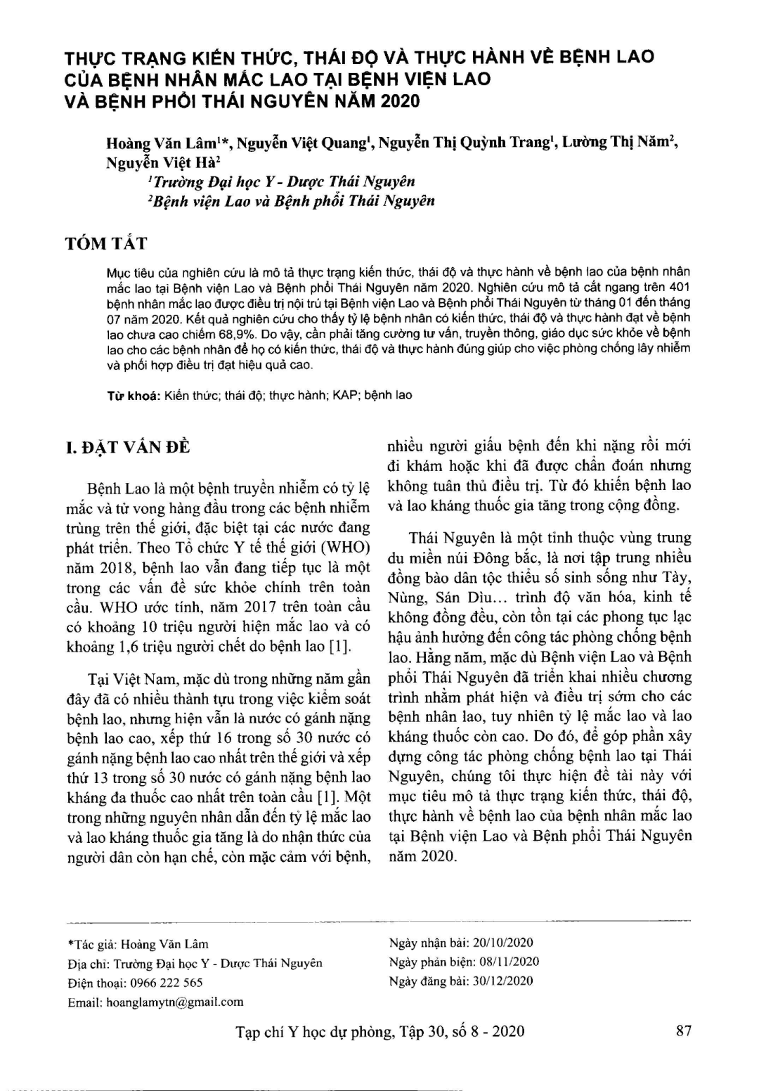 The objective of the study is to describe the current status of knowledge, attitudes and practices about Tuberculosis of TB patients at Thai Nguyen Tuberculosis and Lung Disease hospital 2020. Cross-sectional, descriptive study on 401 TB inpatients treated at Thai Nguyen Tuberculosis and Lung Disease Hospital from January to July 2020. Research results showed that the proportion of patients with good TB disease knowledge, attitudes and practices was not high 68.9%. Therefore, there is a need to strengthen counseling, communication and health education about TB for patients in order to effectively prevent infection and improve treatment coordination.