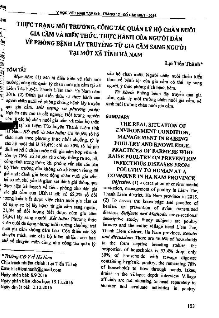 Thực trạng môi trường, công tác quản lý hộ chăn nuôi gia cầm và kiến thức, thực hành của người dân về phòng bệnh lây truyền từ gia cầm sang người tại một xã tỉnh Hà Nam