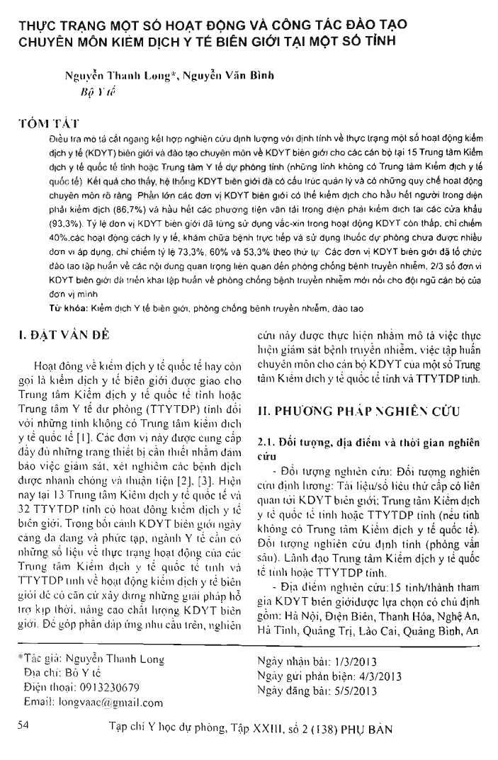 Thực trạng một số hoạt động và công tác đào tạo chuyên môn kiểm dịch y tế biên giới tại một số tỉnh