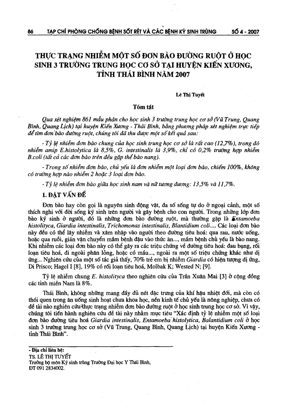 Thực trạng nhiễm một số đơn bào đường ruột của học sinh 3 trường trung học cơ sở tại huyện Kiến Xương tỉnh Thái Bình năm 2007