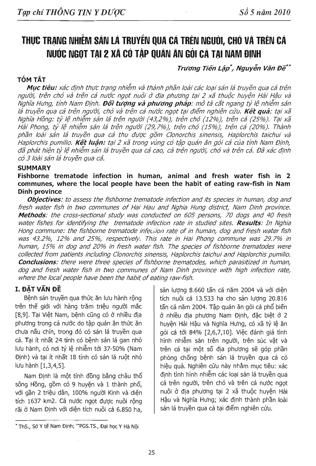 Thực trạng nhiễm sán lá truyền qua cá trên người, chó và trên cá nước ngọt tại 2 xã có tập quán ăn gỏi cá tại Nam Định