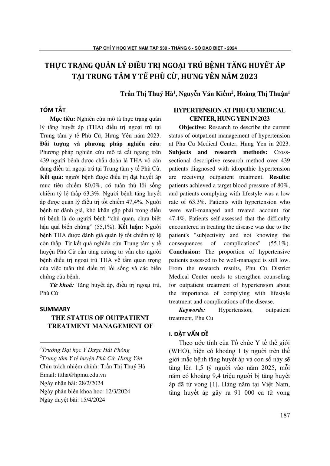 Research to describe the current status of outpatient management of hypertension at Phu Cu Medical Center, Hung Yen in 2023. Subjects and research methods: Cross-sectional descriptive research method over 439 patients diagnosed with idiopathic hypertension are receiving outpatient treatment. Results: patients achieved a target blood pressure of 80%, and patients complying with lifestyle was a low rate of 63.3%. Patients with hypertension who were well-managed and treated account for 47.4%. Patients self-assessed that the difficulty encountered in treating the disease was due to the patient's "subjectivity and not knowing the consequences of complications" (55.1%). Conclusion: The proportion of hypertensive patients assessed to be well-managed is still low. From the research results, Phu Cu District Medical Center needs to strengthen counseling for outpatient treatment of hypertension about the importance of complying with lifestyle treatment and complications of the disease.