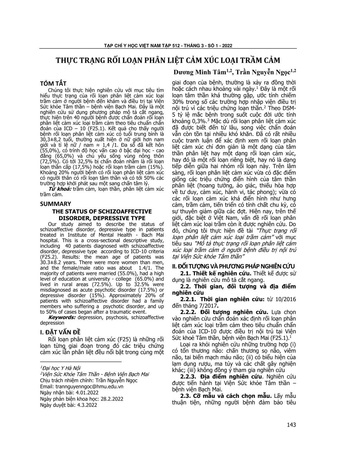Chúng tôi thực hiện nghiên cứu với mục tiêu tìm hiểu thực trạng của rối loạn phân liệt cảm xúc loại trầm cảm ở người bệnh đến khám và điều trị tại Viện Sức khỏe Tâm thần – bệnh viện Bạch Mai. Đây là một nghiên cứu sử dụng phương pháp mô tả cắt ngang, thực hiện trên 40 người bệnh được chẩn đoán rối loạn phân liệt cảm xúc loại trầm cảm theo tiêu chuẩn chẩn đoán của ICD – 10 (F25.1). Kết quả cho thấy người bệnh rối loạn phân liệt cảm xúc có tuổi trung bình là 30,3±8,2 tuổi, thường xuất hiện ở nữ giới hơn nam giới và tỉ lệ nữ / nam ≈ 1,4 /1. Đa số đã kết hôn (55,0%), có trình độ học vấn cao ở bậc đại học - cao đẳng (65,0%) và chủ yếu sống vùng nông thôn (72,5%). Có tới 32,5% bị chẩn đoán nhầm là rối loạn loạn thần cấp (17,5%) hoặc rối loạn trầm cảm (15%). Khoảng 20% người bệnh có rối loạn phân liệt cảm xúc có người thân có rối loạn tâm thần và có tới 50% các trường hợp khởi phát sau một sang chấn tâm lý.