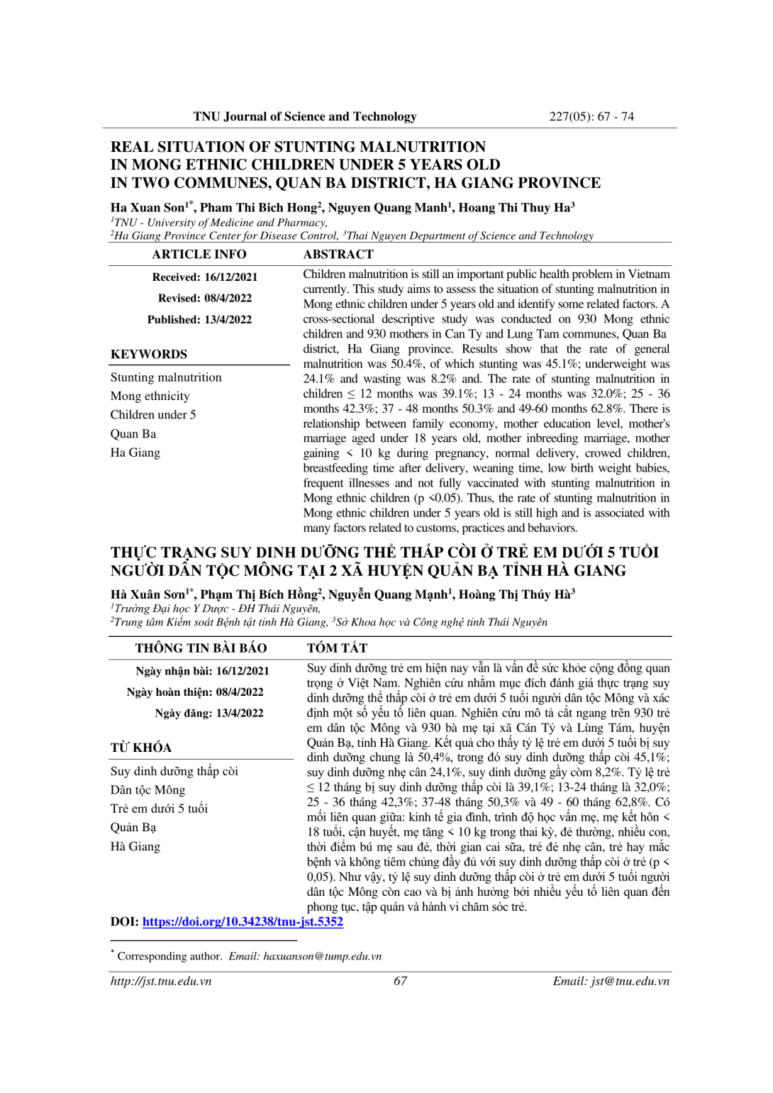 Suy dinh dưỡng trẻ em hiện nay vẫn là vấn đề sức khỏe cộng đồng quan trọng ở Việt Nam. Nghiên cứu nhằm mục đích đánh giá thực trạng suy dinh dưỡng thể thấp còi ở trẻ em dưới 5 tuổi người dân tộc Mông và xác định một số yếu tố liên quan. Nghiên cứu mô tả cắt ngang trên 930 trẻ em dân tộc Mông và 930 bà mẹ tại xã Cán Tỷ và Lùng Tám, huyện Quản Bạ, tỉnh Hà Giang. Kết quả cho thấy tỷ lệ trẻ em dưới 5 tuổi bị suy dinh dưỡng chung là 50,4%, trong đó suy dinh dưỡng thấp còi 45,1%; suy dinh dưỡng nhẹ cân 24,1%, suy dinh dưỡng gầy còm 8,2%. Tỷ lệ trẻ ≤ 12 tháng bị suy dinh dưỡng thấp còi là 39,1%; 13-24 tháng là 32,0%; 25 - 36 tháng 42,3%; 37-48 tháng 50,3% và 49 - 60 tháng 62,8%. Có mối liên quan giữa: kinh tế gia đình, trình độ học vấn mẹ, mẹ kết hôn < 18 tuổi, cận huyết, mẹ tăng < 10 kg trong thai kỳ, đẻ thường, nhiều con, thời điểm bú mẹ sau đẻ, thời gian cai sữa, trẻ đẻ nhẹ cân, trẻ hay mắc bệnh và không tiêm chủng đầy đủ với suy dinh dưỡng thấp còi ở trẻ (p < 0,05). Như vậy, tỷ lệ suy dinh dưỡng thấp còi ở trẻ em dưới 5 tuổi người dân tộc Mông còn cao và bị ảnh hưởng bởi nhiều yếu tố liên quan đến phong tục, tập quán và hành vi chăm sóc trẻ.