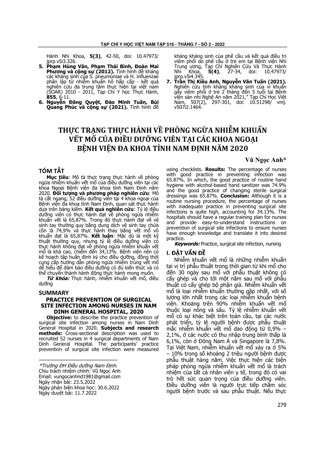 To describe the practice prevention of surgical site infection among nurses in Nam Dinh General Hospital in 2020. Subjects and research methods: Cross-sectional description was used to recruited 52 nurses in 4 surgical departments of Nam Dinh General Hospital. The participants’ practice prevention of surgical site infection were measured using checklists. Results: The percentage of nurses with good practice in preventing infection was 65.87%. In which, the good practice of routine hand hygiene with alcohol-based hand sanitizer was 74.9% and the good practice of changing sterile surgical dressings was 65.87%. Conclusion: Although it is a routine nursing procedure, the percentage of nurses with inadequate practice in preventing surgical site infections is quite high, accounting for 34.13%. The hospitals should have a regular training plan for nurses and provide easy-to-understand instructions on prevention of surgical site infections to ensure nurses have enough knowledge and translate it into desired practice.