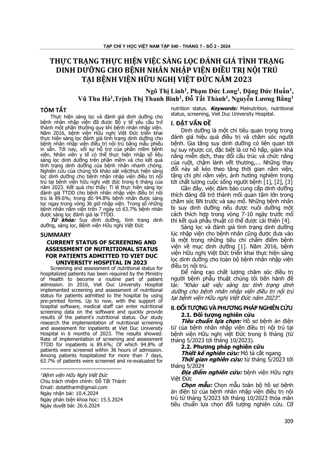Screening and assessment of nutritional status for hospitalized patients has been required by the Ministry of Health to become a routine part of patient admission. In 2016, Viet Duc University Hospital implemented screening and assessment of nutritional status for patients admitted to the hospital by using pre-printed forms. Up to now, with the support of hospital software, medical staff can enter nutritional screening data on the software and quickly provide results of the patient's nutritional status. Our study research the implementation of nutritional screening and assessment for inpatients at Viet Duc University Hospital in 6 months of 2023. The results showed: Rate of implementation of screening and assessment TTDD for inpatients is 89.6%; Of which 94.8% of patients were screened within 36 hours of admission. Among patients hospitalized for more than 7 days, 63.7% of patients were screened and re-evaluated for nutrition status.