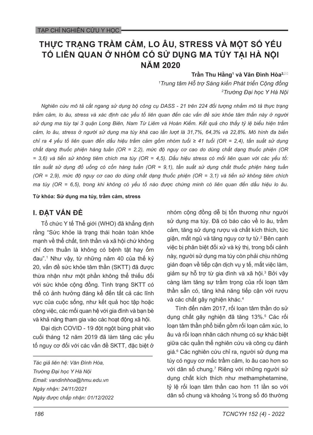 Nghiên cứu mô tả cắt ngang sử dụng bộ công cụ DASS - 21 trên 224 đối tượng nhằm mô tả thực trạng trầm cảm, lo âu, stress và xác định các yếu tố liên quan đến các vấn đề sức khỏe tâm thần này ở người sử dụng ma túy tại 3 quận Long Biên, Nam Từ Liêm và Hoàn Kiếm. Kết quả cho thấy tỷ lệ biểu hiện trầm cảm, lo âu, stress ở người sử dụng ma túy khá cao lần lượt là 31,7%, 64,3% và 22,8%. Mô hình đa biến chỉ ra 4 yếu tố liên quan đến dấu hiệu trầm cảm gồm nhóm tuổi ≥ 41 tuổi (OR = 2,4), tần suất sử dụng chất dạng thuốc phiện hàng tuần (OR = 2,2), mức độ nguy cơ cao do dùng chất dạng thuốc phiện (OR = 3,6) và tiền sử không tiêm chích ma túy (OR = 4,5). Dấu hiệu stress có mối liên quan với các yếu tố: tần suất sử dụng đồ uống có cồn hàng tuần (OR = 9,1), tần suất sử dụng chất thuốc phiện hàng tuần (OR = 2,9), mức độ nguy cơ cao do dùng chất dạng thuốc phiện (OR = 3,1) và tiền sử không tiêm chích ma túy (OR = 6,5), trong khi không có yếu tố nào được chứng minh có liên quan đến dấu hiệu lo âu.