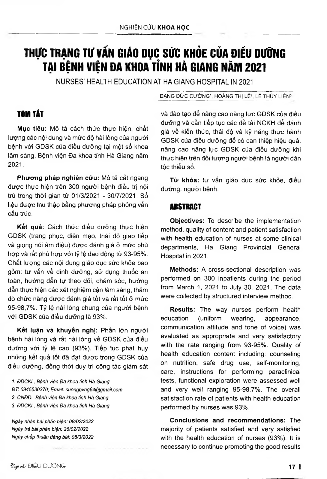 To describe the implementation method, quality of content and patient satisfaction with health education of nurses at some clinical departments, Ha Giang Provincial General Hospital in 2021. Methods: A cross-sectional description was performed on 300 inpatients during the period from March 1, 2021 to July 30, 2021. The data were collected by structured interview method. Results: The way nurses perform health education (uniform wearing, appearance, communication attitude and tone of voice) was evaluated as appropriate and very satisfactory with the rate ranging from 93-95%. Quality of health education content including: counseling on nutrition, safe drug use, self-monitoring, care, instructions for performing paraclinical tests, functional exploration were assessed well and very well ranging 95-98.7%. The overall satisfaction rate of patients with health education performed by nurses was 93%. Conclusions and recommendations: The majority of patients satisfied and very satisfied with the health education of nurses (93%). It is necessary to continue promoting the good results achieved in health education of nurses while maintaining supervision and training to further improve nurses’ health education competence and conduct research to assess knowledge, attitudes and skills to perform health education for patients in order to have effective interventions to increase nurses’ competency of health education provided to patients, especially to patients who are ethnic minorities.