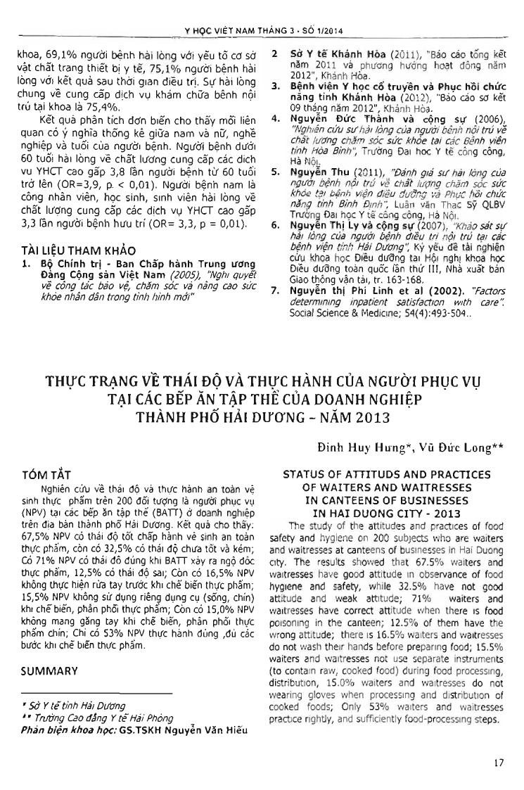 The study of the attitudes and practices of food safety and hygiene on 200 subjects who are waiters and waitresses at canteens of businesses in Hai Duong city. The results showed that 67.5 percent waiters and waitresses have good attitude 'in observance of food hygiene and safety, while 32.5 percent have not good attitude and weak attitude;71 percent waiters and waitresses have correct attitude when there is food poisoning in the canteen; 12.5 percent of them have the wrong attitude; there is 16.5 percent waiters and waitresses do not wash their hands before preparing food; 15.5 percent waiters and waitresses not use separate instruments (to contain raw, cooked food) during food processing, distribution, 15.0 percent waiters and waitresses do not wearing gloves when processing and distribution of cooked foods; Only 53 percent waiters and waitresses practice rightly, and sufficiently food-processing steps.