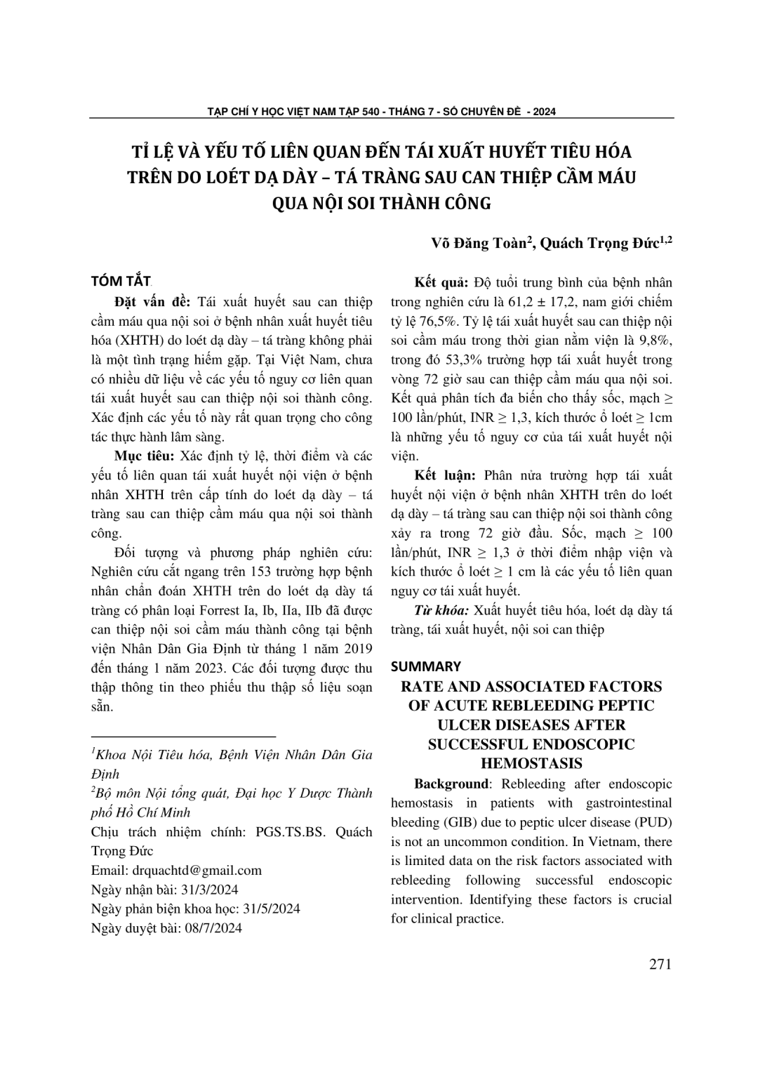 Xác định tỷ lệ, thời điểm và các yếu tố liên quan tái xuất huyết nội viện ở bệnh nhân XHTH trên cấp tính do loét dạ dày – tá tràng sau can thiệp cầm máu qua nội soi thành công. Đối tượng và phương pháp nghiên cứu: Nghiên cứu cắt ngang trên 153 trường hợp bệnh nhân chẩn đoán XHTH trên do loét dạ dày tá tràng có phân loại Forrest Ia, Ib, IIa, IIb đã được can thiệp nội soi cầm máu thành công tại bệnh viện Nhân Dân Gia Định từ tháng 1 năm 2019 đến tháng 1 năm 2023. Các đối tượng được thu thập thông tin theo phiếu thu thập số liệu soạn sẵn. Kết quả: Độ tuổi trung bình của bệnh nhân trong nghiên cứu là 61,2 ± 17,2, nam giới chiếm tỷ lệ 76,5%. Tỷ lệ tái xuất huyết sau can thiệp nội soi cầm máu trong thời gian nằm viện là 9,8%, trong đó 53,3% trường hợp tái xuất huyết trong vòng 72 giờ sau can thiệp cầm máu qua nội soi. Kết quả phân tích đa biến cho thấy sốc, mạch ≥ 100 lần/phút, INR ≥ 1,3, kích thước ổ loét ≥ 1cm là những yếu tố nguy cơ của tái xuất huyết nội viện. Kết luận: Phân nửa trường hợp tái xuất huyết nội viện ở bệnh nhân XHTH trên do loét dạ dày – tá tràng sau can thiệp nội soi thành công xảy ra trong 72 giờ đầu. Sốc, mạch ≥ 100 lần/phút, INR ≥ 1,3 ở thời điểm nhập viện và kích thước ổ loét ≥ 1 cm là các yếu tố liên quan nguy cơ tái xuất huyết.
