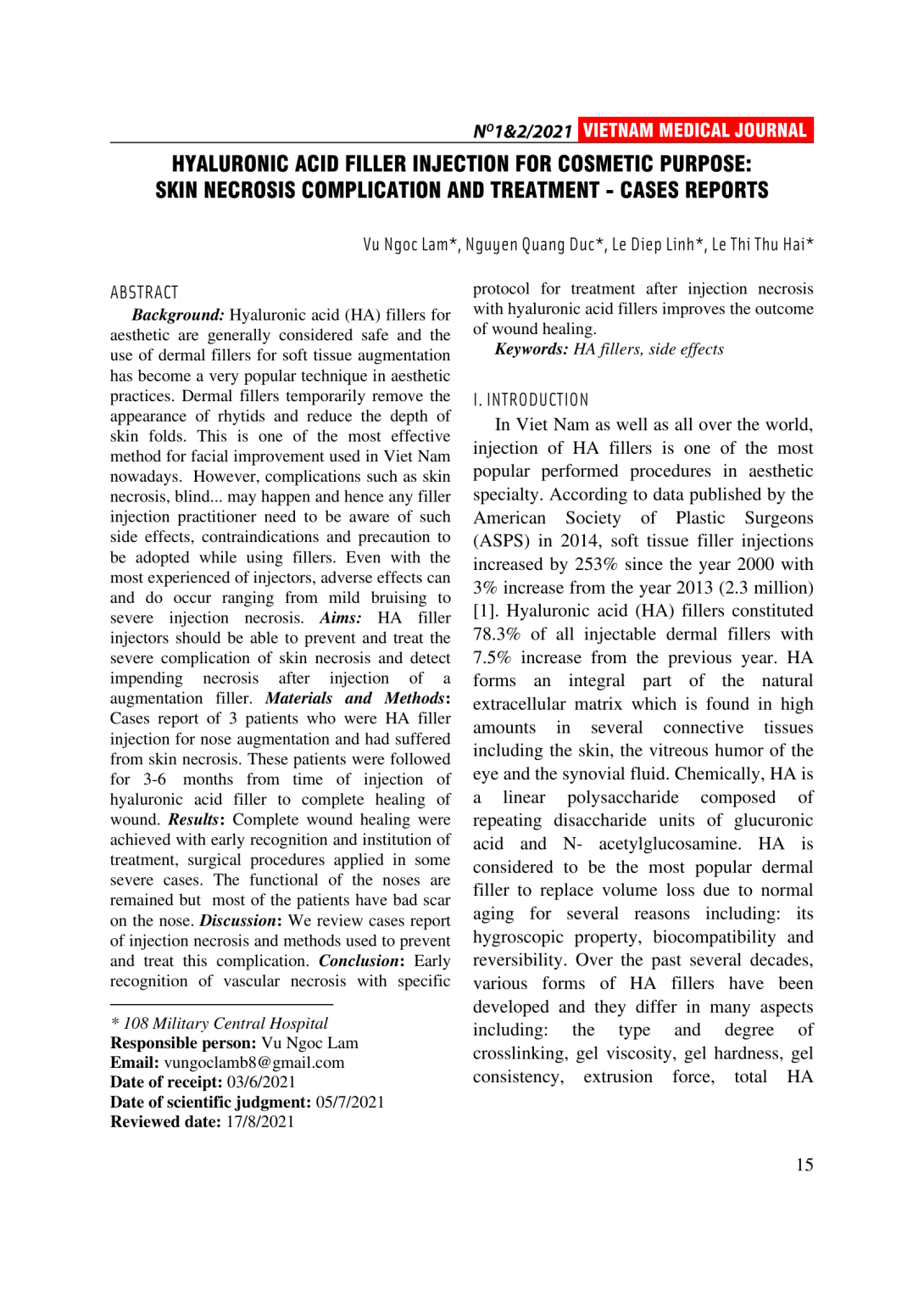 Tiêm chất làm đầy HA có thể ngăn ngừa và điều trị các biến chứng nghiêm trọng của hoại tử da và phát hiện tình trạng hoại tử sắp xảy ra sau khi tiêm chất làm đầy nâng cơ. Vật liệu và phương pháp: Báo cáo trường hợp 3 bệnh nhân tiêm chất làm đầy HA để nâng mũi bị hoại tử da. Những bệnh nhân này được theo dõi từ 3-6 tháng kể từ thời điểm tiêm chất làm đầy axit hyaluronic để vết thương lành hoàn toàn. Kết quả: Việc chữa lành vết thương hoàn toàn đạt được nhờ sự nhận biết sớm và tổ chức điều trị, các thủ thuật phẫu thuật được áp dụng trong một số trường hợp nặng. Chức năng của các mũi vẫn được giữ nguyên nhưng hầu hết các bệnh nhân đều có sẹo xấu trên mũi. Thảo luận: Chúng tôi xem xét các trường hợp báo cáo về hoại tử vết tiêm và các phương pháp được sử dụng để ngăn ngừa và điều trị biến chứng này. Kết luận: Nhận biết sớm tình trạng hoại tử mạch máu với phác đồ cụ thể để điều trị hoại tử sau khi tiêm chất làm đầy axit hyaluronic giúp cải thiện kết quả chữa lành vết thương.