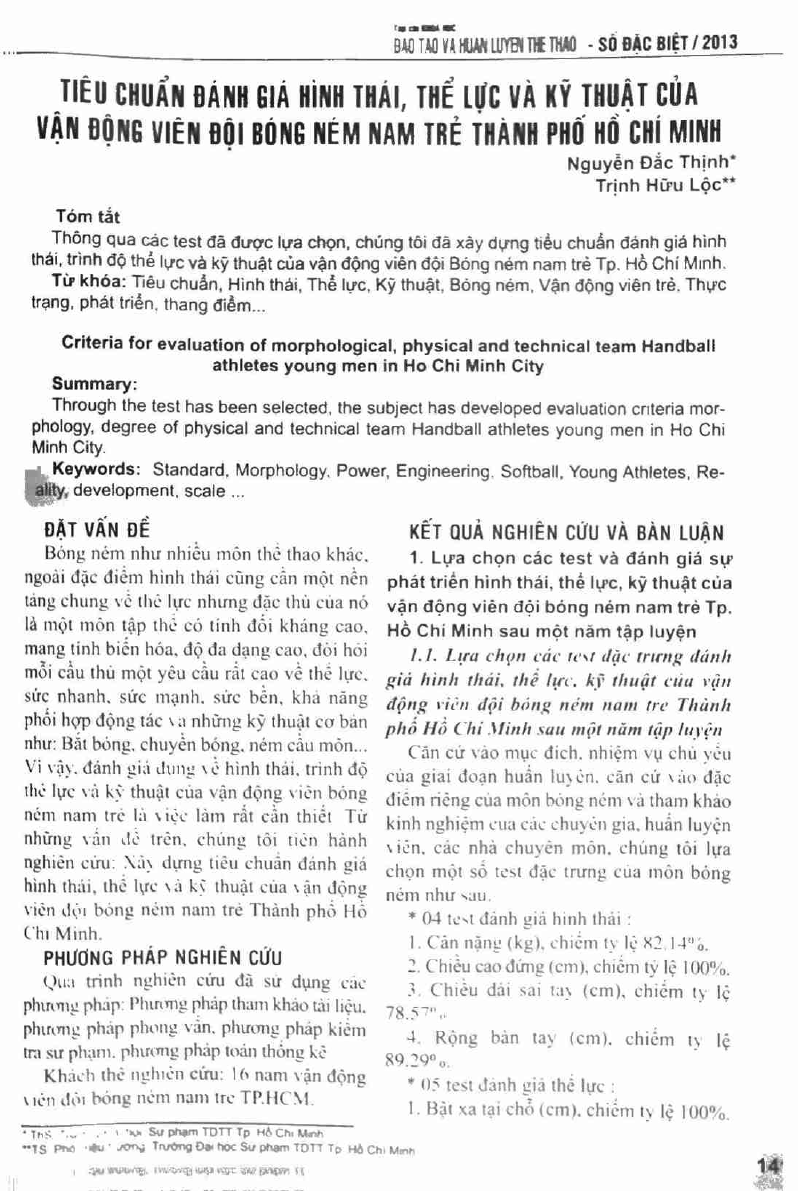 Tiêu chuẩn đánh giá hình thái, thể lực và kỹ thuật của vận động viên đội bóng ném nam trẻ Thành phố Hồ Chí Minh