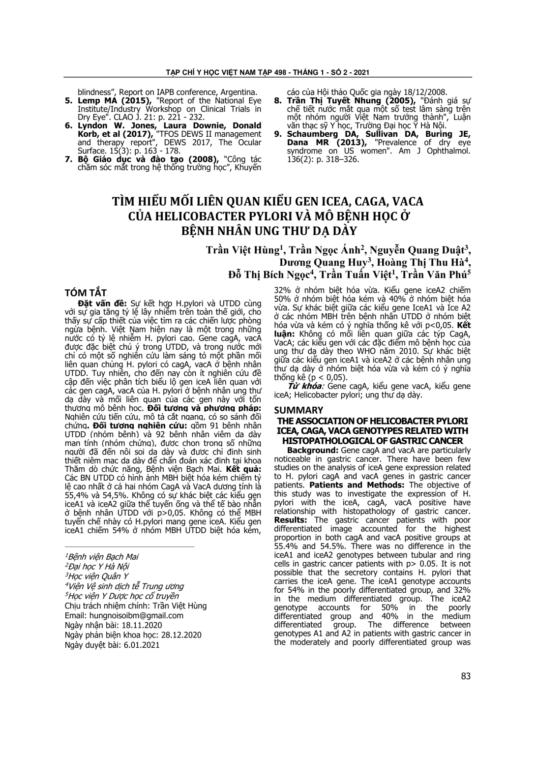 Sự kết hợp H.pylori và UTDD cùng với sự gia tăng tỷ lệ lây nhiễm trên toàn thế giới, cho thấy sự cấp thiết của việc tìm ra các chiến lược phòng ngừa bệnh. Việt Nam hiện nay là một trong những nước có tỷ lệ nhiễm H. pylori cao. Gene cagA, vacA được đặc biệt chú ý trong UTDD, và trong nước mới chỉ có một số nghiên cứu làm sáng tỏ một phần mối liên quan chủng H. pylori có cagA, vacA ở bệnh nhân UTDD. Tuy nhiên, cho đến nay còn ít nghiên cứu đề cập đến việc phân tích biểu lộ gen iceA liên quan với các gen cagA, vacA của H. pylori ở bệnh nhân ung thư dạ dày và mối liên quan của các gen này với tổn thương mô bệnh học. Đối tượng và phương pháp: Nghiên cứu tiến cứu, mô tả cắt ngang, có so sánh đối chứng. Đối tượng nghiên cứu: gồm 91 bệnh nhân UTDD (nhóm bệnh) và 92 bệnh nhân viêm dạ dày mạn tính (nhóm chứng), được chọn trong số những người đã đến nội soi dạ dày và được chỉ định sinh thiết niêm mạc dạ dày để chẩn đoán xác định tại khoa Thăm dò chức năng, Bệnh viện Bạch Mai. Kết quả: Các BN UTDD có hình ảnh MBH biệt hóa kém chiếm tỷ lệ cao nhất ở cả hai nhóm CagA và VacA dương tính là 55,4% và 54,5%. Không có sự khác biệt các kiểu gen iceA1 và iceA2 giữa thể tuyến ống và thể tế bào nhẫn ở bệnh nhân UTDD với p>0,05. Không có thể MBH tuyến chế nhày có H.pylori mang gene iceA. Kiểu gen iceA1 chiếm 54% ở nhóm MBH UTDD biệt hóa kém, 32% ở nhóm biệt hóa vừa. Kiểu gene iceA2 chiếm 50% ở nhóm biệt hóa kém và 40% ở nhóm biệt hóa vừa. Sự khác biệt giữa các kiểu gene IceA1 và Ice A2 ở các nhóm MBH trên bệnh nhân UTDD ở nhóm biệt hóa vừa và kém có ý nghĩa thống kê với p<0,05. Kết luận: Không có mối liên quan giữa các týp CagA, VacA; các kiểu gen với các đặc điểm mô bệnh học của ung thư dạ dày theo WHO năm 2010. Sự khác biệt giữa các kiểu gen iceA1 và iceA2 ở các bệnh nhân ung thư dạ dày ở nhóm biệt hóa vừa và kém có ý nghĩa thống kê (p < 0,05).