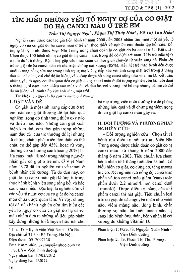 The study was conducted from 2000 to 2003 to examine the risk factors of seiwres due to hypocalcaemia in children with cohort design. The total of 100 children diagnosed with seizure due to hypocalcaemia in National Hospital of Pediatrics were included in this study. The results showcd that there were 60 percent males among 100 children with seizures due to hypocalcaemia. Most of the children were less than 6 months of age (74 percent) and usually had seizures during Spring or transition time between Spring and Summer. Most of children with seizures due to hypocalcaemia had symptoms of rickets (85 percent). Most of children were breastfed and their mothers had no exposure to sun light for the first 3 months postpartum with a strict diet and no supplements of calcium and vitamin D. Conclusions: Risk factors related to seizures due to hypocalcaemia in this study are children less than 6 months of age, spring and beginning of Summer, rickets, breasted child of mothers with strict diet and no exposure to sun light.