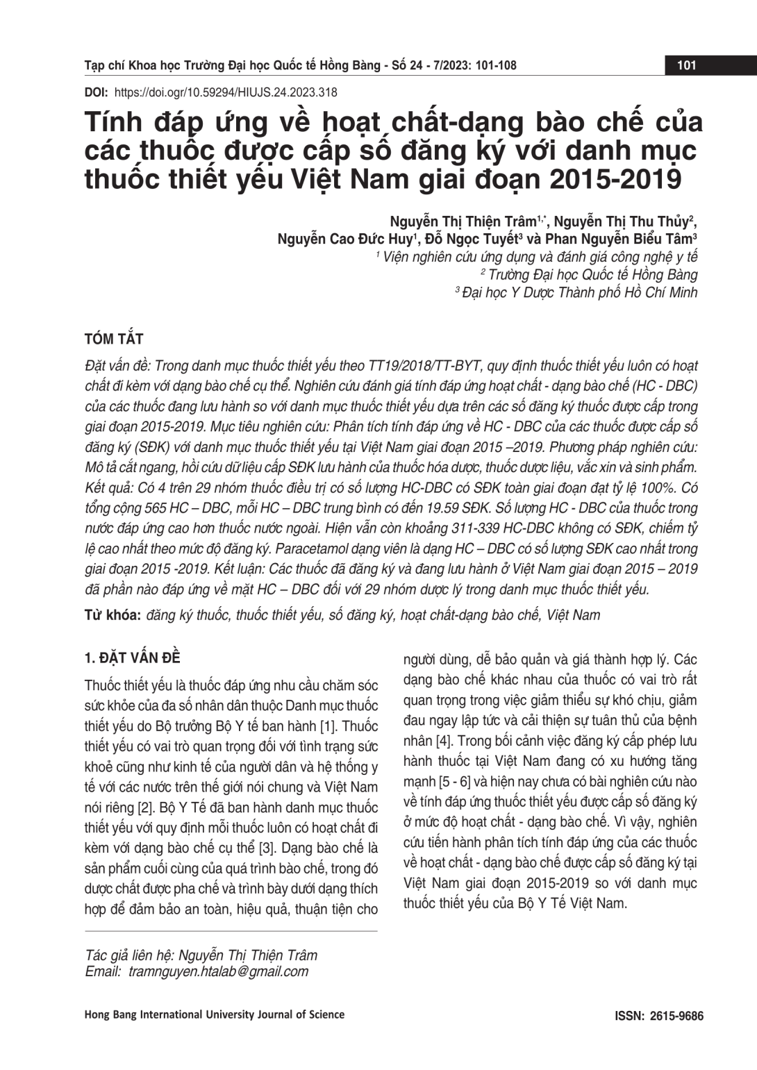 Trong danh mục thuốc thiết yếu theo TT19/2018/TT-BYT, quy định thuốc thiết yếu luôn có hoạt chất đi kèm với dạng bào chế cụ thể. Nghiên cứu đánh giá tính đáp ứng hoạt chất - dạng bào chế (HC - DBC) của các thuốc đang lưu hành so với danh mục thuốc thiết yếu dựa trên các số đăng ký thuốc được cấp trong giai đoạn 2015-2019. Mục tiêu nghiên cứu: Phân tích tính đáp ứng về HC - DBC của các thuốc được cấp số đăng ký (SĐK) với danh mục thuốc thiết yếu tại Việt Nam giai đoạn 2015 –2019. Phương pháp nghiên cứu: Mô tả cắt ngang, hồi cứu dữ liệu cấp SĐK lưu hành của thuốc hóa dược, thuốc dược liệu, vắc xin và sinh phẩm. Kết quả: Có 4 trên 29 nhóm thuốc điều trị có số lượng HC-DBC có SĐK toàn giai đoạn đạt tỷ lệ 100%. Có tổng cộng 565 HC – DBC, mỗi HC – DBC trung bình có đến 19.59 SĐK. Số lượng HC - DBC của thuốc trong nước đáp ứng cao hơn thuốc nước ngoài. Hiện vẫn còn khoảng 311-339 HC-DBC không có SĐK, chiếm tỷ lệ cao nhất theo mức độ đăng ký. Paracetamol dạng viên là dạng HC – DBC có số lượng SĐK cao nhất trong giai đoạn 2015 -2019. Kết luận: Các thuốc đã đăng ký và đang lưu hành ở Việt Nam giai đoạn 2015 – 2019 đã phần nào đáp ứng về mặt HC – DBC đối với 29 nhóm dược lý trong danh mục thuốc thiết yếu.
