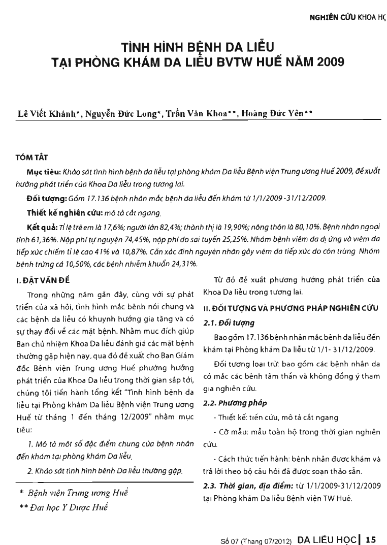 Objectives: To evaluate the situation of skin diseases at the Dermatological clinic of Hue Central Hospital from Jan. 1st to Dec. 31th in 2009: general characteristics of the patients, frequency of some skin diseases. To propose the development of Dermatological Department in future. Subjects: 17.137 patients who went to the dermatological clinic from Jan 1st to Dec 31 th in 2009. Methods: Cross sectional study. Results: The percentages of skin diseases is 17.6 percent in adult and 82.4 percent in children. 19.90 percent of patients lived in Hue city and 80.10 percent lived in rural. 61.36 percent of patients lived in the other provinces. The allergic dermatitis and contact dermatitis groups account for 41 percent and 10.87 percent. Prevalence ofacnes and infectious diseases is 10.50 percent and 24.31 percent. Preventions of these diseases are also important.