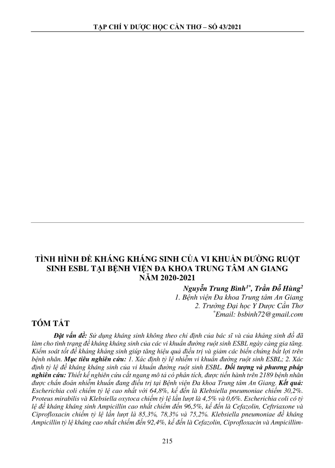 Sử dụng kháng sinh không theo chỉ định của bác sĩ và của kháng sinh đồ đã làm cho tình trạng đề kháng kháng sinh của các vi khuẩn đường ruột sinh ESBL ngày càng gia tăng. Kiểm soát tốt đề kháng kháng sinh giúp tăng hiệu quả điều trị và giảm các biến chứng bất lợi trên bệnh nhân. Mục tiêu nghiên cứu: 1. Xác định tỷ lệ nhiễm vi khuẩn đường ruột sinh ESBL; 2. Xác định tỷ lệ đề kháng kháng sinh của vi khuẩn đường ruột sinh ESBL. Đối tượng và phương pháp nghiên cứu: Thiết kế nghiên cứu cắt ngang mô tả có phân tích, được tiến hành trên 2189 bệnh nhân được chẩn đoán nhiễm khuẩn đang điều trị tại Bệnh viện Đa khoa Trung tâm An Giang. Kết quả: Escherichia coli chiếm tỷ lệ cao nhất với 64,8%, kế đến là Klebsiella pneumoniae chiếm 30,2%. Proteus mirabilis và Klebsiella oxytoca chiếm tỷ lệ lần lượt là 4,5% và 0,6%. Escherichia coli có tỷ lệ đề kháng kháng sinh Ampicillin cao nhất chiếm đến 96,5%, kế đến là Cefazolin, Ceftriaxone và Ciprofloxacin chiếm tỷ lệ lần lượt là 85,3%, 78,3% và 75,2%. Klebsiella pneumoniae đề kháng Ampicillin tỷ lệ kháng cao nhất chiếm đến 92,4%, kế đến là Cefazolin, Ciprofloxacin và Ampicillim-Sulbactam chiếm tỷ lệ lần lượt là 60,2%, 57,1% và 56,3%. Klebsiella oxytoca đề kháng Ampicillin tỷ lệ kháng cao nhất chiếm đến 83,3%, kế đến là Cefazolin, Trimethoprim-Sulfamethoxazole và Ceftriaxone chiếm tỷ lệ lần lượt là 72,7%, 66,7% và 58,3%. Proteus mirabilis đề kháng Trimethoprim-Sulfamethoxazole cao nhất chiếm đến 92,0%, kế đến là Ampicillin, Ciprofloxacin và Tobramycin lần lượt là 90,8%, 84,0% và 72,9%. Kết luận: Escherichia coli là vi khuẩn gây bệnh thường gặp nhất. Hầu hết vi khuẩn đề kháng Ampicillin và Cefazolin