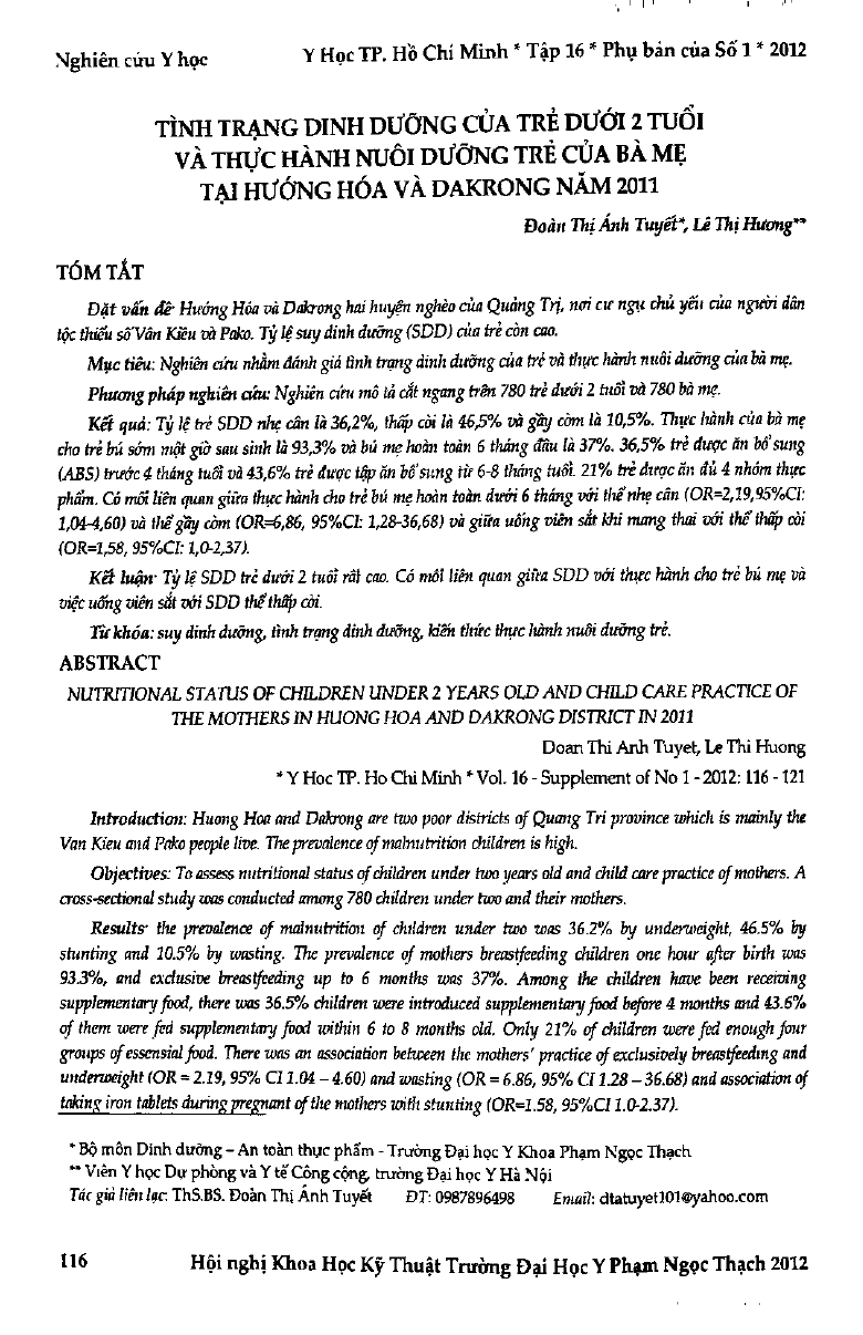 Tình trạng dinh dưỡng của trẻ dưới 2 tuổi và thực hành nuôi dưỡng trẻ của bà mẹ tại Hướng Hóa và Dakrong năm 2011