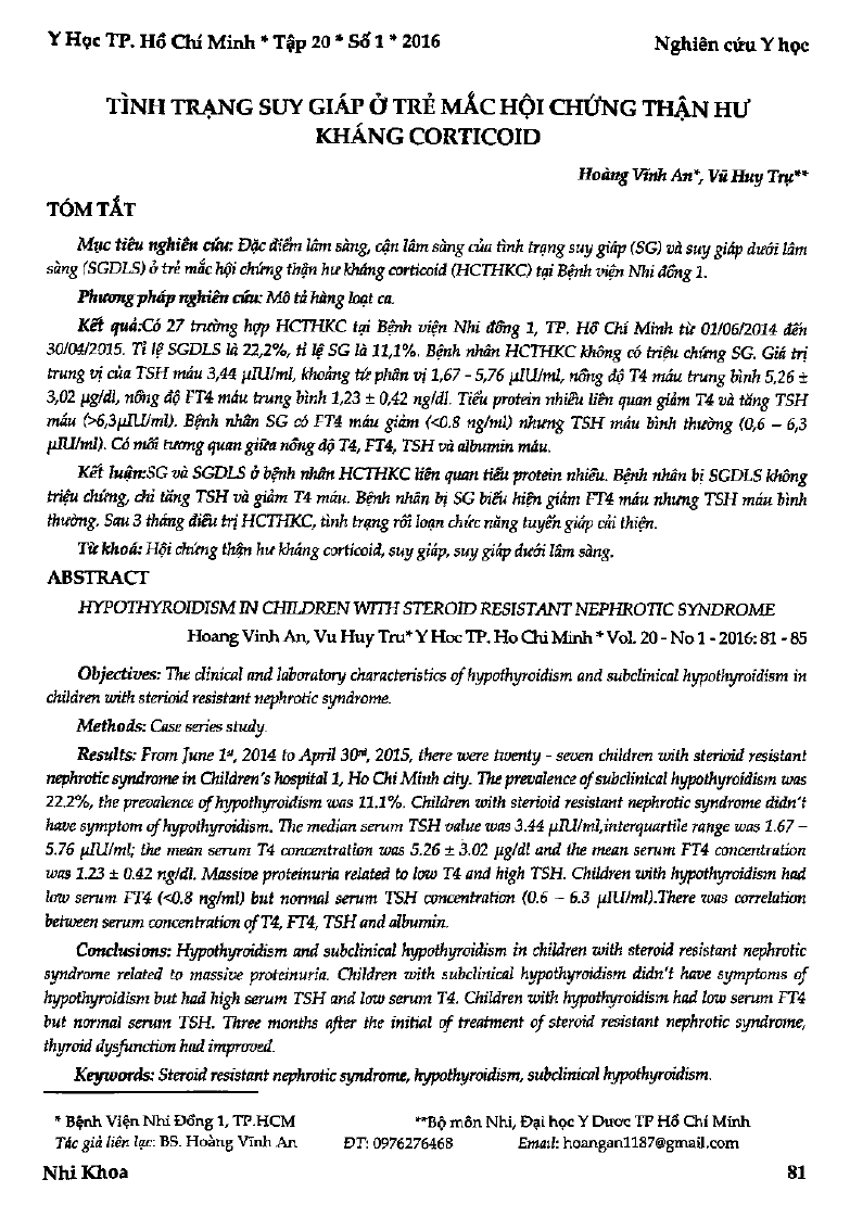Có 27 trường hợp mắc hội chứng thận hư kháng corticoid tại bệnh viện Nhi đồng 1 từ 6/2014 đến 4/2015. Tỷ lệ suy giáp dưới lâm sàng là 22,2 phần trăm và tỷ lệ suy giáp là 11,1 phần trăm. Bệnh nhân hội chứng thận hư kháng corticoid không có triệu chứng suy giáp. Bệnh nhân suy giáp có FT4 máu giảm nhưng TSH máu bình thường. Có mối tương quan giữa nồng độ T4, FT4, TSH và albumin máu.