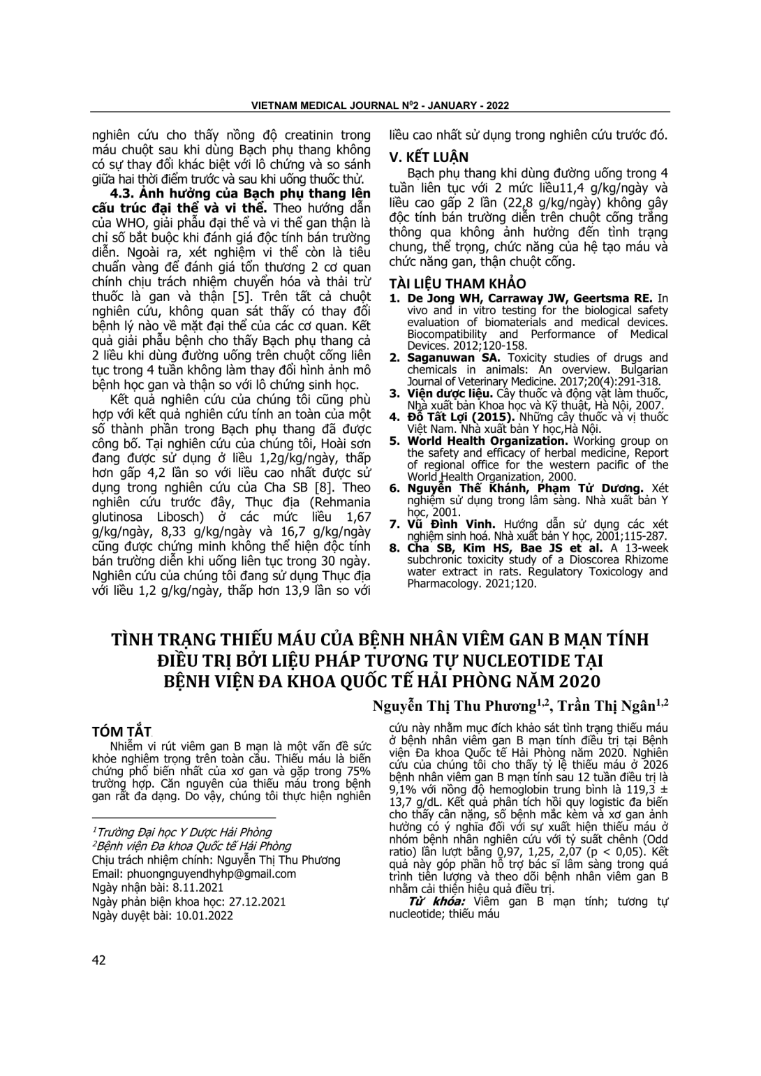 Nhiễm vi rút viêm gan B mạn là một vấn đề sức khỏe nghiêm trọng trên toàn cầu. Thiếu máu là biến chứng phổ biến nhất của xơ gan và gặp trong 75% trường hợp. Căn nguyên của thiếu máu trong bệnh gan rất đa dạng. Do vậy, chúng tôi thực hiện nghiên cứu này nhằm mục đích khảo sát tình trạng thiếu máu ở bệnh nhân viêm gan B mạn tính điều trị tại Bệnh viện Đa khoa Quốc tế Hải Phòng năm 2020. Nghiên cứu của chúng tôi cho thấy tỷ lệ thiếu máu ở 2026 bệnh nhân viêm gan B mạn tính sau 12 tuần điều trị là 9,1% với nồng độ hemoglobin trung bình là 119,3 ± 13,7 g/dL. Kết quả phân tích hồi quy logistic đa biến cho thấy cân nặng, số bệnh mắc kèm và xơ gan ảnh hưởng có ý nghĩa đối với sự xuất hiện thiếu máu ở nhóm bệnh nhân nghiên cứu với tỷ suất chênh (Odd ratio) lần lượt bằng 0,97, 1,25, 2,07 (p < 0,05). Kết quả này góp phần hỗ trợ bác sĩ lâm sàng trong quá trình tiên lượng và theo dõi bệnh nhân viêm gan B nhằm cải thiện hiệu quả điều trị.