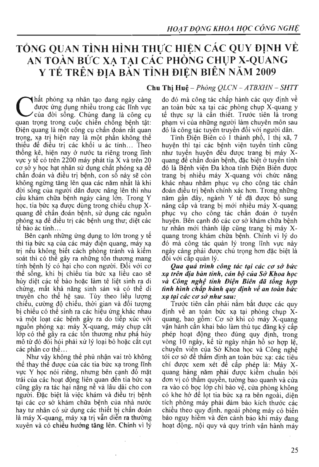 Tổng quan tình hình thực hiện các quy định về an toàn bức xạ tại các phòng chụp X-Quang y tế trên địa bàn tỉnh Điện Biên năm 2009.