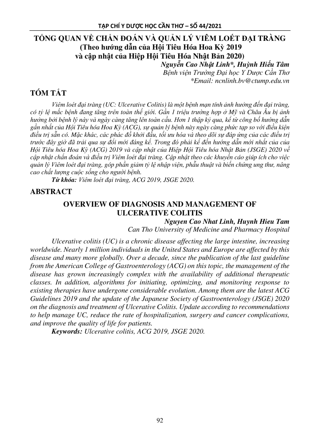 Viêm loét đại tràng (UC: Ulcerative Colitis) là một bệnh mạn tính ảnh hưởng đến đại tràng, có tỷ lệ mắc bệnh đang tăng trên toàn thế giới. Gần 1 triệu trường hợp ở Mỹ và Châu Âu bị ảnh hưởng bởi bệnh lý này và ngày càng tăng lên toàn cầu. Hơn 1 thập kỷ qua, kể từ công bố hướng dẫn gần nhất của Hội Tiêu hóa Hoa Kỳ (ACG), sự quản lý bệnh này ngày càng phức tạp so với điều kiện điều trị sẵn có. Mặc khác, các phác đồ khởi đầu, tối ưu hóa và theo dõi sự đáp ứng của các điều trị trước đây giờ đã trải qua sự đổi mới đáng kể. Trong đó phải kể đến hướng dẫn mới nhất của của Hội Tiêu hóa Hoa Kỳ (ACG) 2019 và cập nhật của Hiệp Hội Tiêu hóa Nhật Bản (JSGE) 2020 về cập nhật chẩn đoán và điều trị Viêm loét đại tràng. Cập nhật theo các khuyến cáo giúp ích cho việc quản lý Viêm loét đại tràng, góp phần giảm tỷ lệ nhập viện, phẫu thuật và biến chứng ung thư, nâng cao chất lượng cuộc sống cho người bệnh.