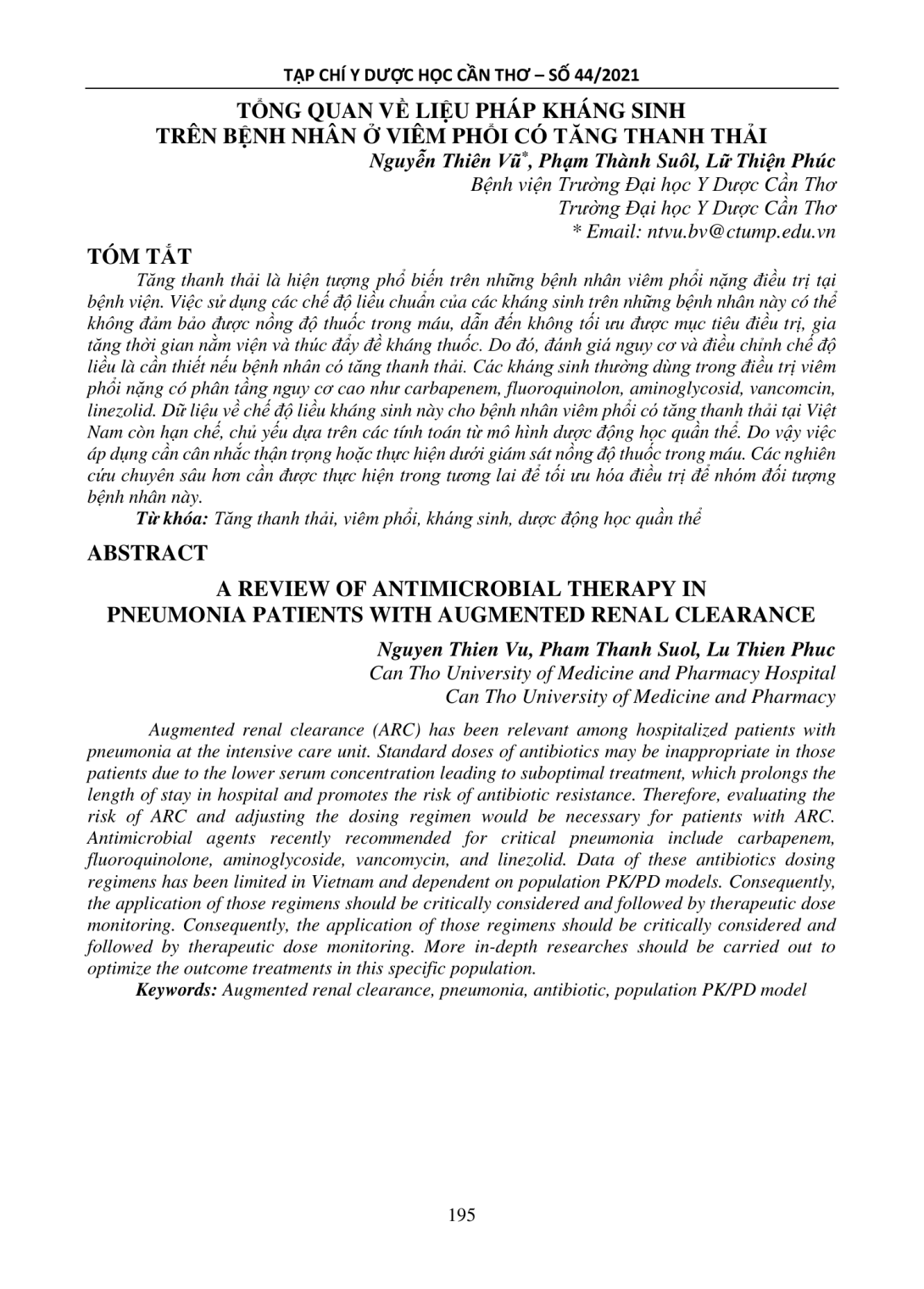 Tăng thanh thải là hiện tượng phổ biến trên những bệnh nhân viêm phổi nặng điều trị tại bệnh viện. Việc sử dụng các chế độ liều chuẩn của các kháng sinh trên những bệnh nhân này có thể không đảm bảo được nồng độ thuốc trong máu, dẫn đến không tối ưu được mục tiêu điều trị, gia tăng thời gian nằm viện và thúc đẩy đề kháng thuốc. Do đó, đánh giá nguy cơ và điều chỉnh chế độ liều là cần thiết nếu bệnh nhân có tăng thanh thải. Các kháng sinh thường dùng trong điều trị viêm phổi nặng có phân tầng nguy cơ cao như carbapenem, fluoroquinolon, aminoglycosid, vancomcin, linezolid. Dữ liệu về chế độ liều kháng sinh này cho bệnh nhân viêm phổi có tăng thanh thải tại Việt Nam còn hạn chế, chủ yếu dựa trên các tính toán từ mô hình dược động học quần thể. Do vậy việc áp dụng cần cân nhắc thận trọng hoặc thực hiện dưới giám sát nồng độ thuốc trong máu. Các nghiên cứu chuyên sâu hơn cần được thực hiện trong tương lai để tối ưu hóa điều trị để nhóm đối tượng bệnh nhân này