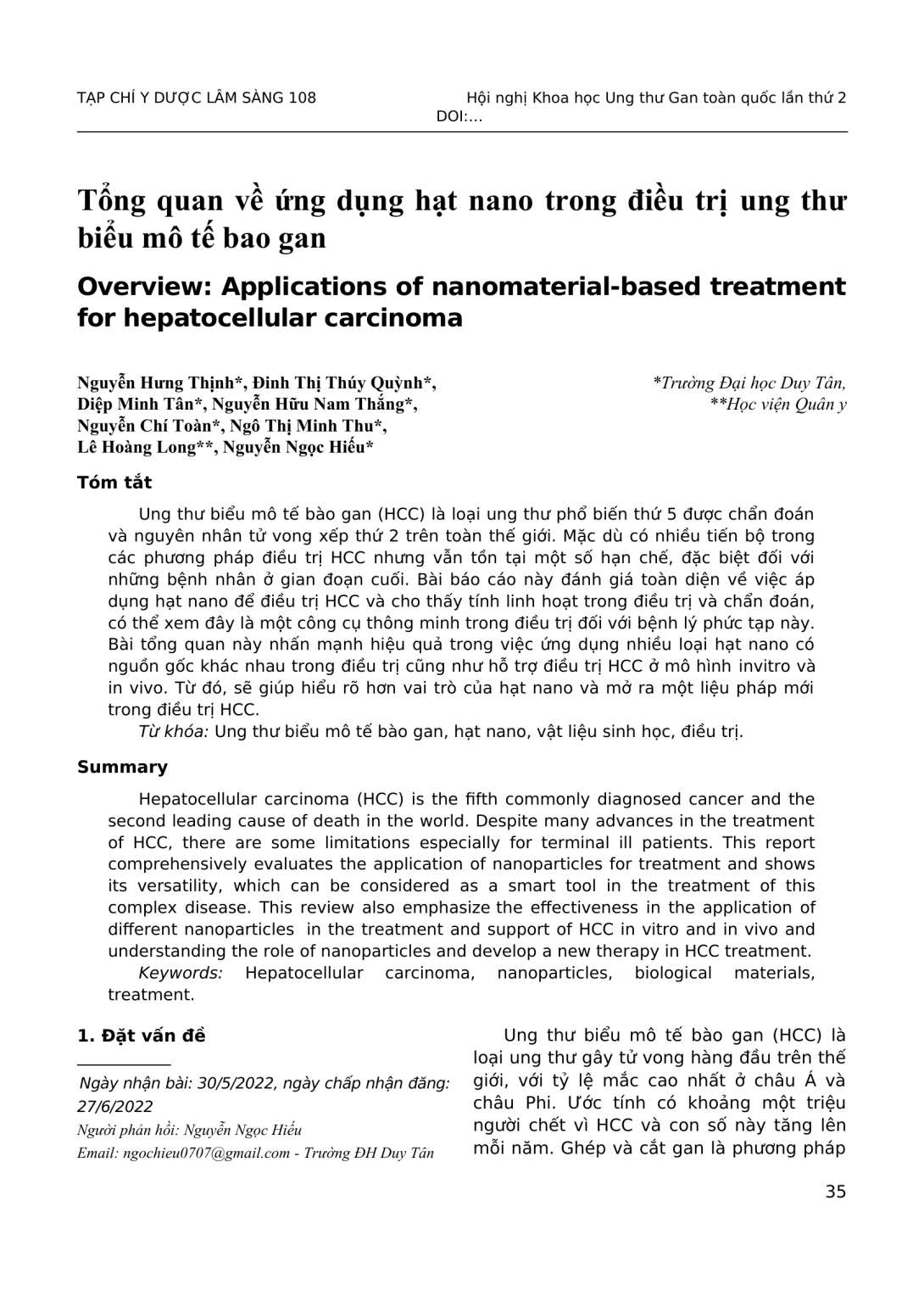 Ung thư biểu mô tế bào gan (HCC) là loại ung thư phổ biến thứ 5 được chẩn đoán và nguyên nhân tử vong xếp thứ 2 trên toàn thế giới. Mặc dù có nhiều tiến bộ trong các phương pháp điều trị HCC nhưng vẫn tồn tại một số hạn chế, đặc biệt đối với những bệnh nhân ở gian đoạn cuối. Bài báo cáo này đánh giá toàn diện về việc áp dụng hạt nano để điều trị HCC và cho thấy tính linh hoạt trong điều trị và chẩn đoán, có thể xem đây là một công cụ thông minh trong điều trị đối với bệnh lý phức tạp này. Bài tổng quan này nhấn mạnh hiệu quả trong việc ứng dụng nhiều loại hạt nano có nguồn gốc khác nhau trong điều trị cũng như hỗ trợ điều trị HCC ở mô hình invitro và in vivo. Từ đó, sẽ giúp hiểu rõ hơn vai trò của hạt nano và mở ra một liệu pháp mới trong điều trị HCC.