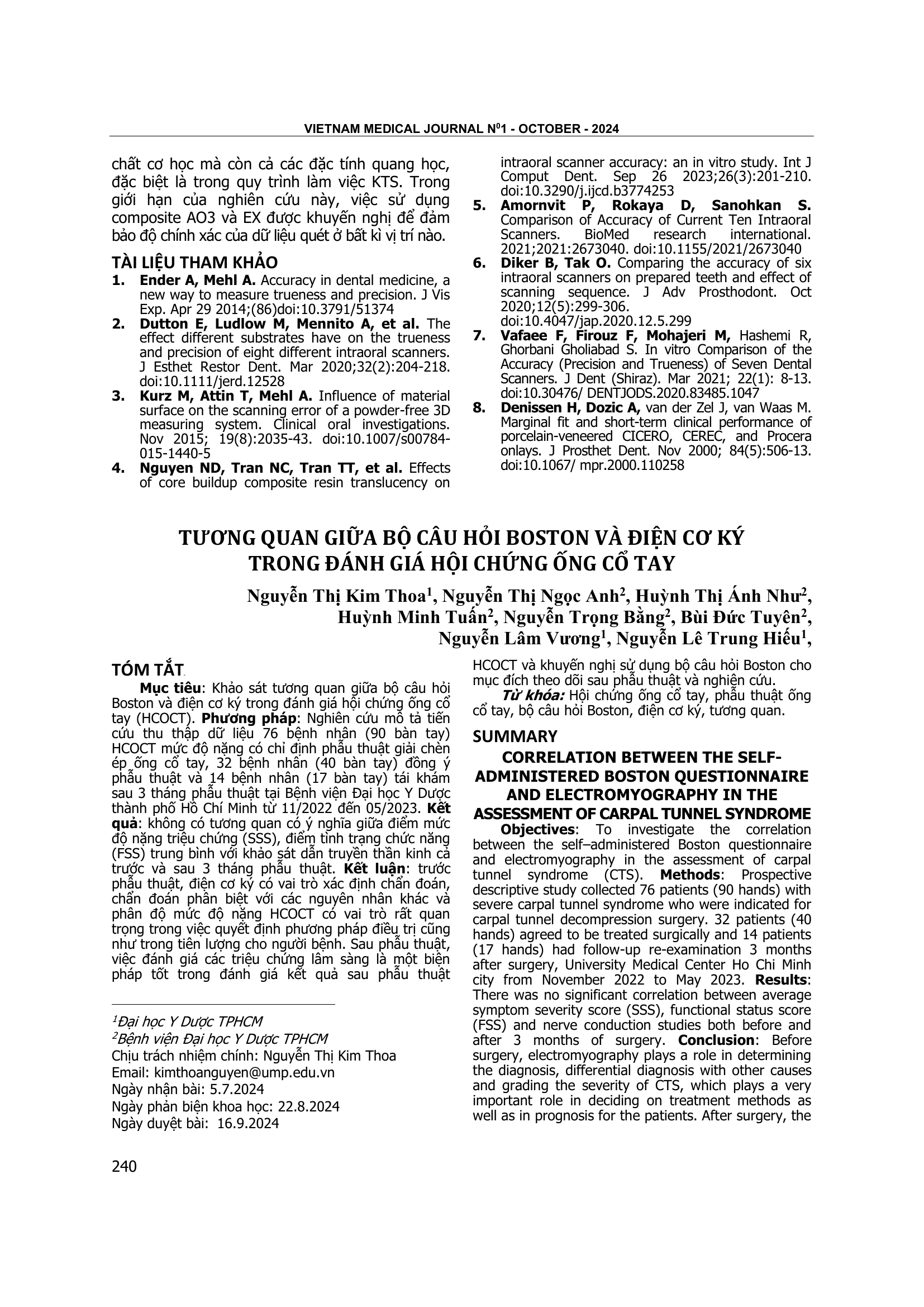 Khảo sát tương quan giữa bộ câu hỏi Boston và điện cơ ký trong đánh giá hội chứng ống cổ tay (HCOCT). Phương pháp: Nghiên cứu mô tả tiến cứu thu thập dữ liệu 76 bệnh nhân (90 bàn tay) HCOCT mức độ nặng có chỉ định phẫu thuật giải chèn ép ống cổ tay, 32 bệnh nhân (40 bàn tay) đồng ý phẫu thuật và 14 bệnh nhân (17 bàn tay) tái khám sau 3 tháng phẫu thuật tại Bệnh viện Đại học Y Dược thành phố Hồ Chí Minh từ 11/2022 đến 05/2023. Kết quả: không có tương quan có ý nghĩa giữa điểm mức độ nặng triệu chứng (SSS), điểm tình trạng chức năng (FSS) trung bình với khảo sát dẫn truyền thần kinh cả trước và sau 3 tháng phẫu thuật. Kết luận: trước phẫu thuật, điện cơ ký có vai trò xác định chẩn đoán, chẩn đoán phân biệt với các nguyên nhân khác và phân độ mức độ nặng HCOCT có vai trò rất quan trọng trong việc quyết định phương pháp điều trị cũng như trong tiên lượng cho người bệnh. Sau phẫu thuật, việc đánh giá các triệu chứng lâm sàng là một biện pháp tốt trong đánh giá kết quả sau phẫu thuật HCOCT và khuyến nghị sử dụng bộ câu hỏi Boston cho mục đích theo dõi sau phẫu thuật và nghiên cứu.