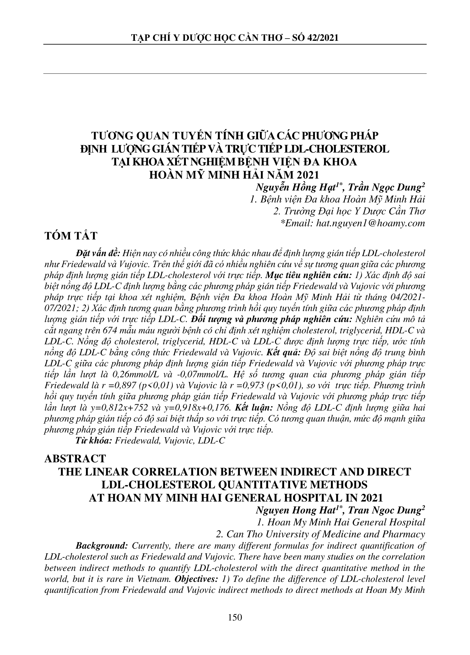Currently, there are many different formulas for indirect quantification of LDL-cholesterol such as Friedewald and Vujovic. There have been many studies on the correlation between indirect methods to quantify LDL-cholesterol with the direct quantitative method in the world, but it is rare in Vietnam. Objectives: 1) To define the difference of LDL-cholesterol level quantification from Friedewald and Vujovic indirect methods to direct methods at Hoan My Minh Hai General Hospital in 04/2021-07/2021. 2) To define the linear correlate regression of LDLcholesterol level quantification from Friedewald and Vujovic indirect methods to direct method LDL-C. Materials and methods: A cross-sectional descriptive study was carried out of 674 blood samples in patients indicated for cholesterol, triglycerides, HDL-C and LDL-C. The level of cholesterol, triglycerides, HDL-C and LDL-C were quantified by direct method, by the way, the LDL-cholesterol level was calculated by Friedewald and Vujovic indirect methods. Results: The difference of mean LDL-C from Friedewald (Mean LDLdiff (PPTT-Fiedewald)) and Vujovic indirect methods (Mean LDLdiff (PPTT-Vujovic)) to direct method, respectively were 0.26mmol/L and - 0.07mmol/L. Correlation coefficients of Friedewald indirect method was r=0.897 (p<0.01) and Vujovic indirect method was r=0.937 (p<0.01), compared with direct method. The linear logistic regression equation between indirect methods and with direct is y=0.812x+752 of Friedewald and is y=0.918x+0.176 of Vujovic. Conclusion: There is a low difference of LDL-C concentration and a positive and strong linear regression correlation between the Friedewald and Vujovic indirect quantitative methods with the direct quantitative method.